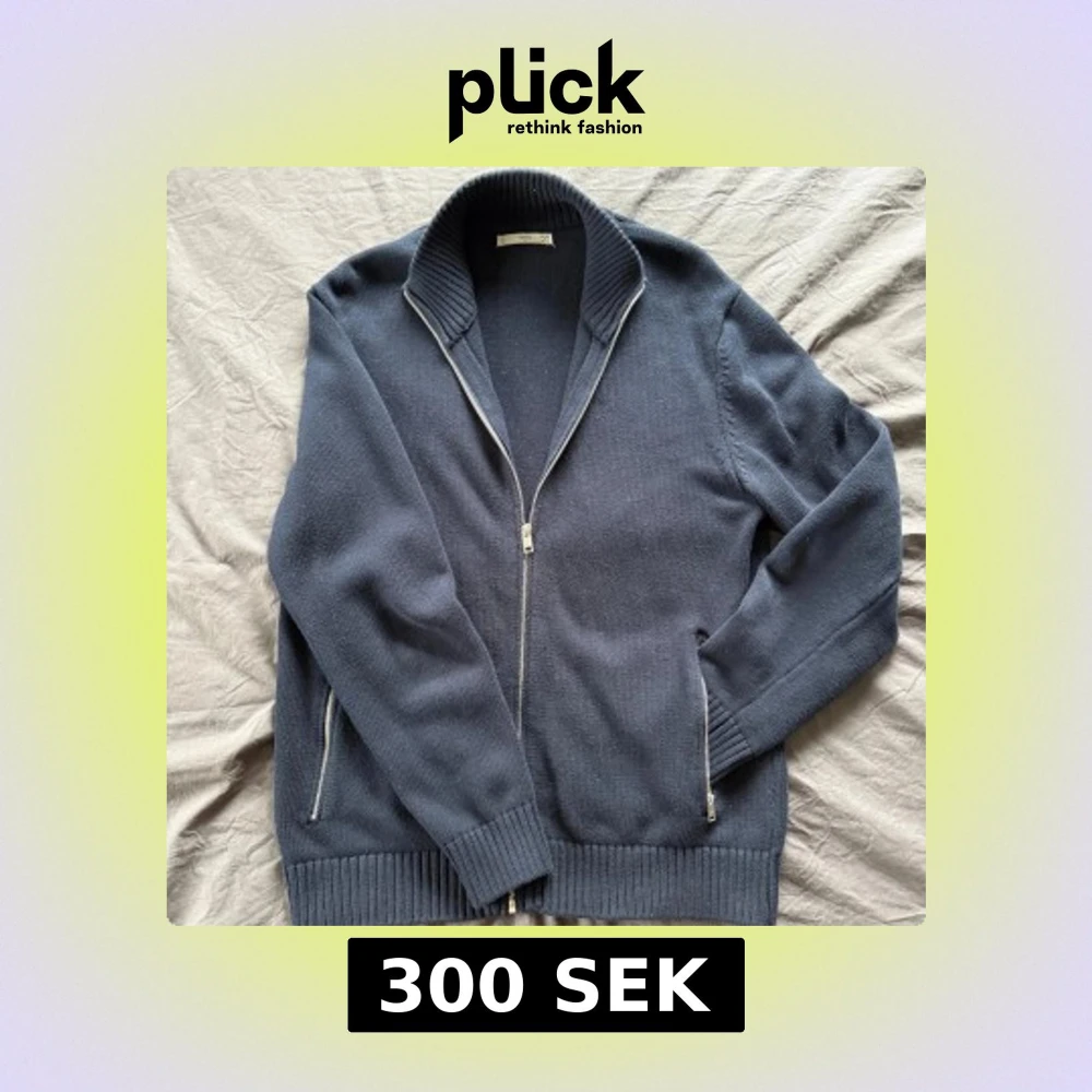 Säljer en stilren mörkblå cardigan från MNG med dragkedja framtill och två praktiska fickor med dragkedjor.