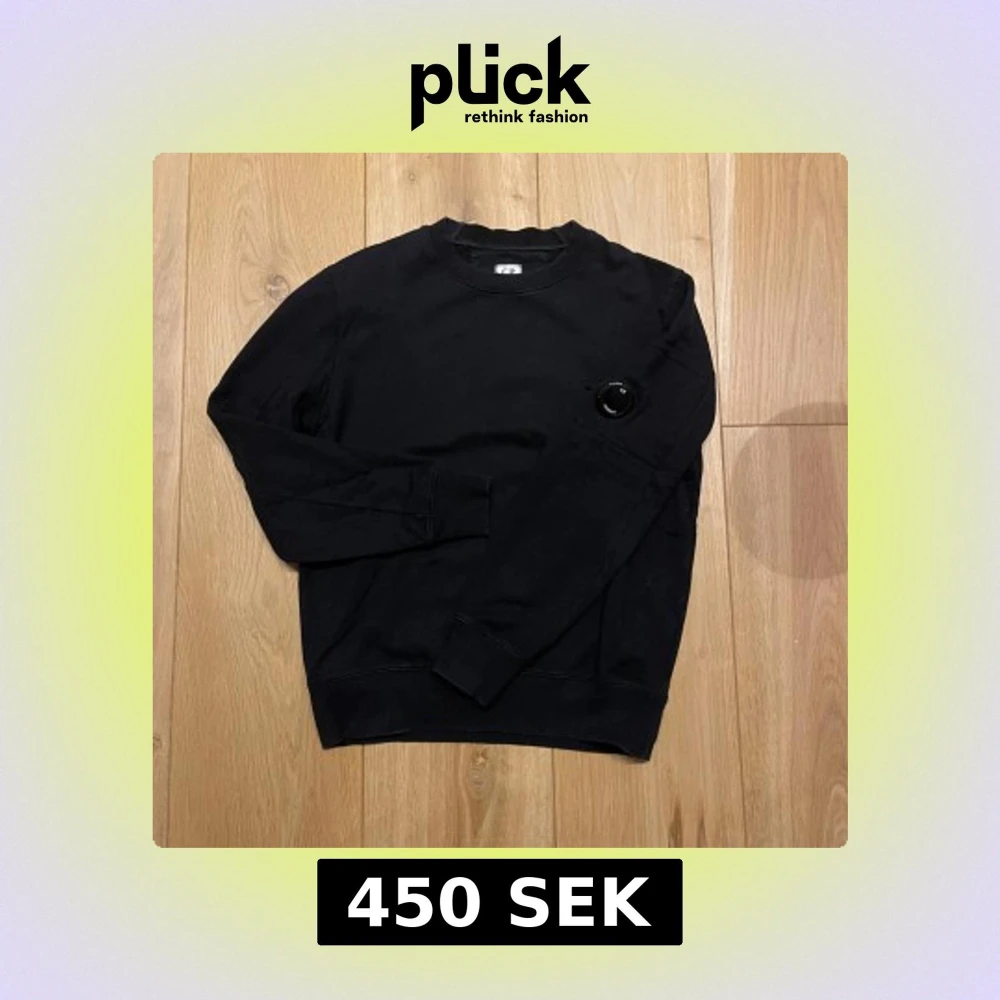 En stilren svart sweatshirt från C.P. Company med rund halsringning och klassisk passform. Tröjan har en unik detalj med en lins på ena ärmen, vilket är typiskt för märket. Perfekt för en avslappnad och trendig look.
