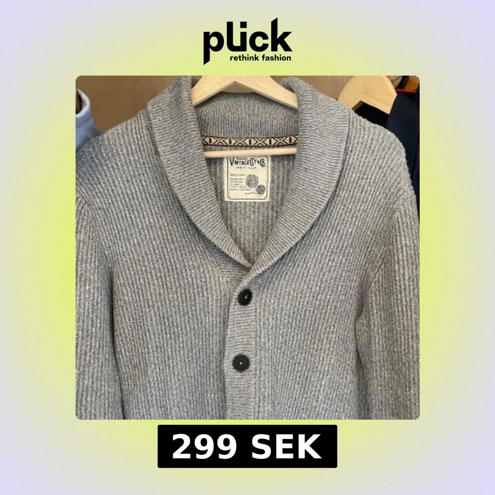 Säljer en grå stickad kofta med bred krage och två knappar framtill. Koftan har lång ärm och är ribbstickad för en klassisk look. Perfekt att slänga på sig när det är kyligt ute.