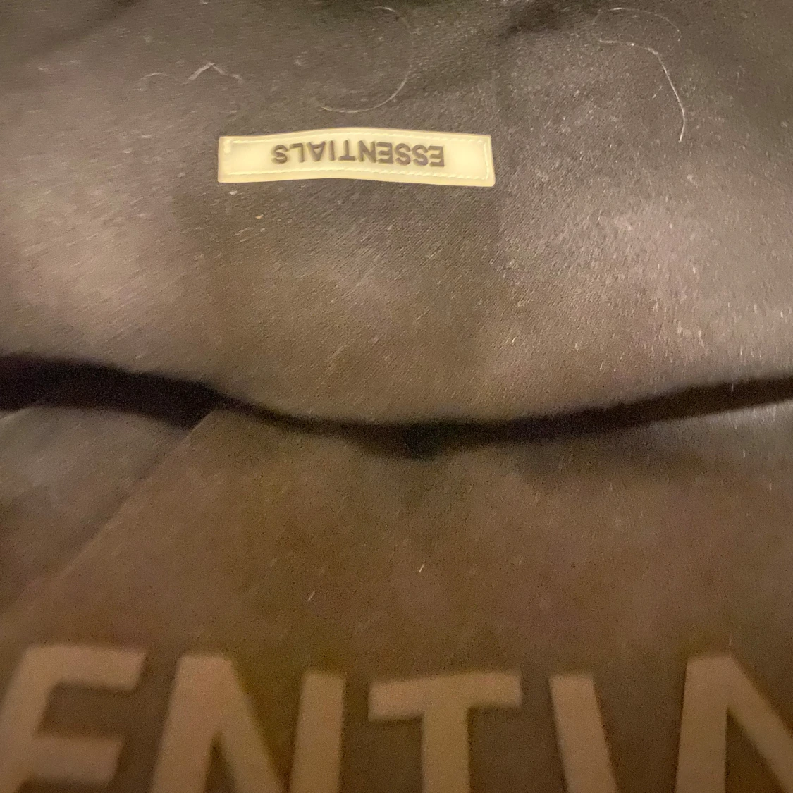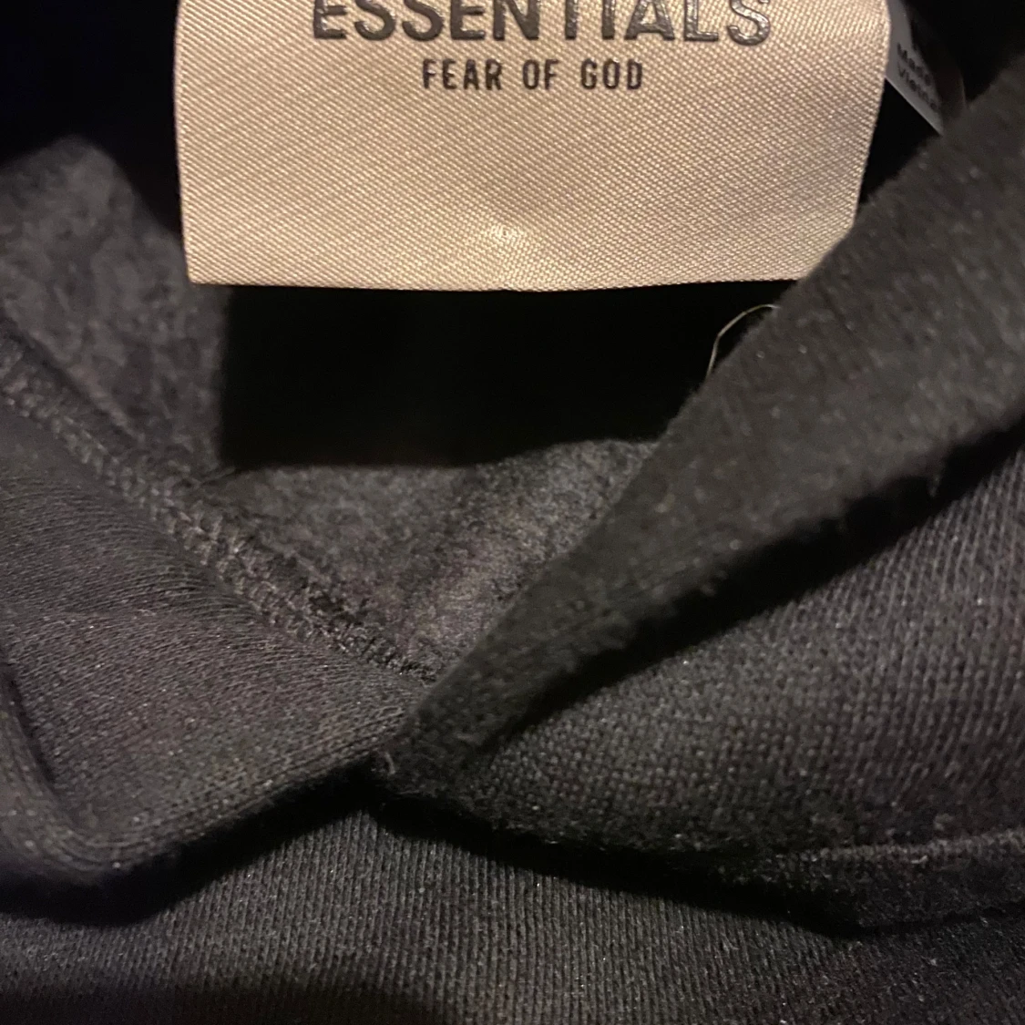 Säljer en svart Essentials hoodie från Fear of God. Den har en stor logga på bröstet och en mindre på ärmen. Perfekt för en stilren och avslappnad look.