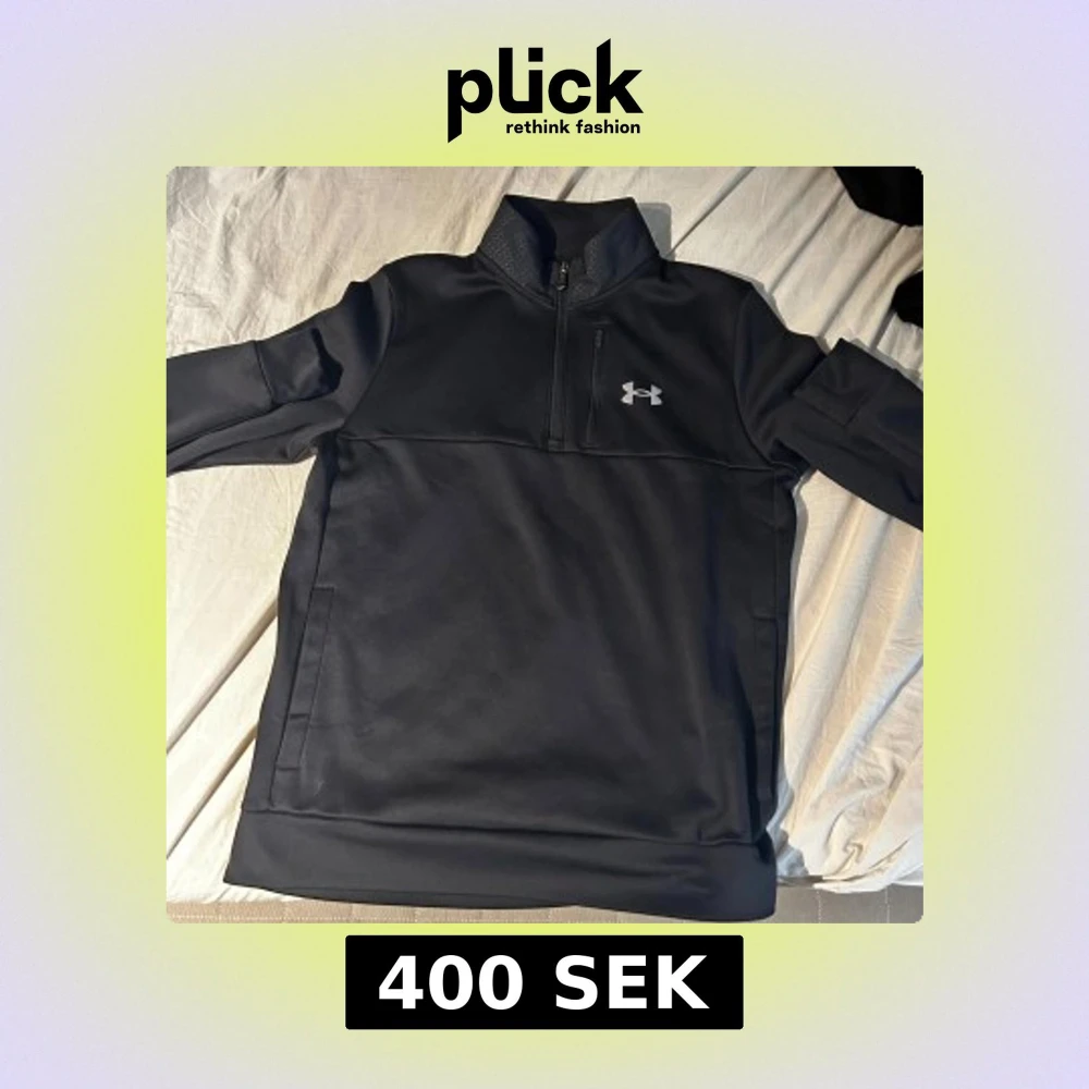 Säljer en svart tröja från Under Armour med halv dragkedja och hög krage. Perfekt för träning eller vardagsbruk. Tröjan har en diskret logga på bröstet och är tillverkad i ett mjukt material.