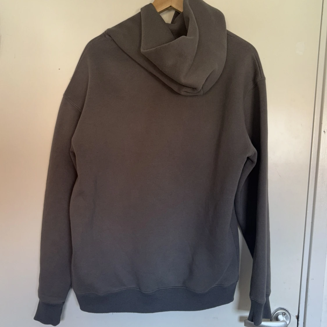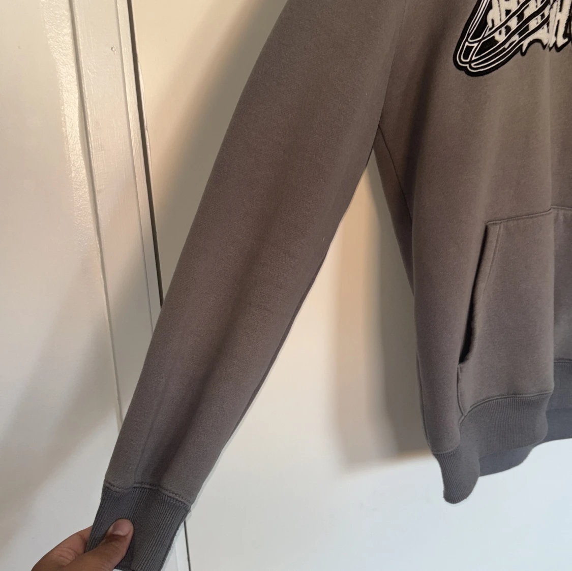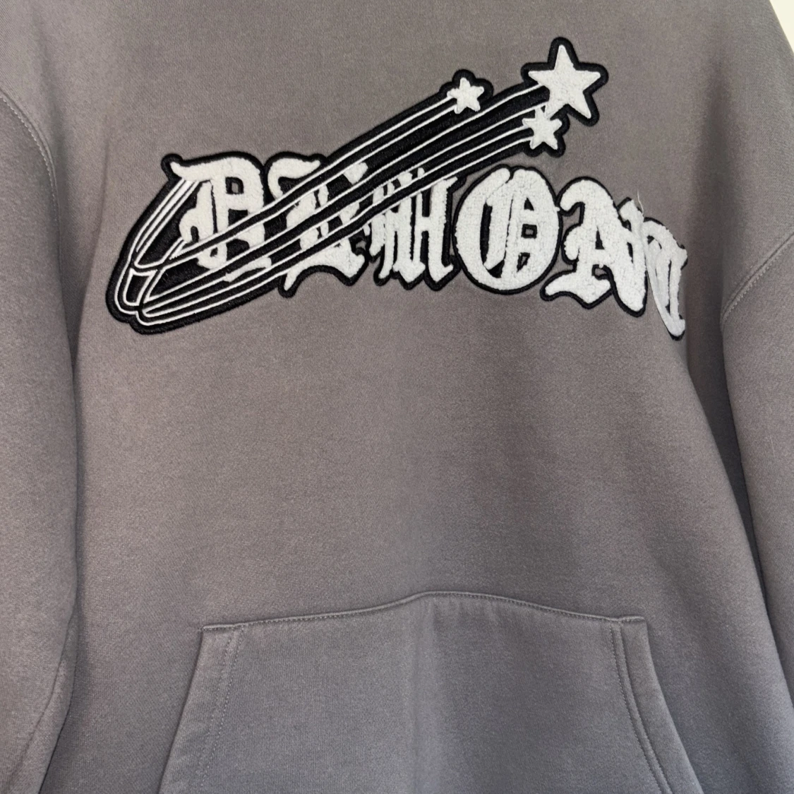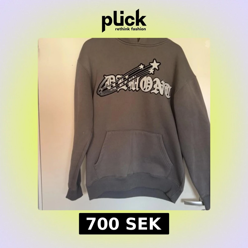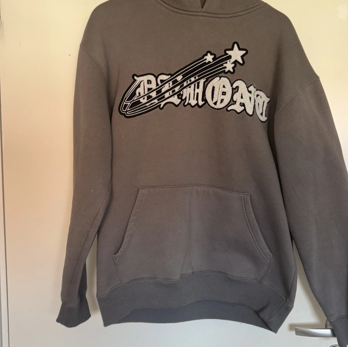 Säljer en grå hoodie från Belmont med stort vitt och svart tryck på bröstet och coola stjärndetaljer. Tröjan har huva, magficka och långa ärmar med ribbade muddar. Perfekt för chill dagar och streetwear-stil.
