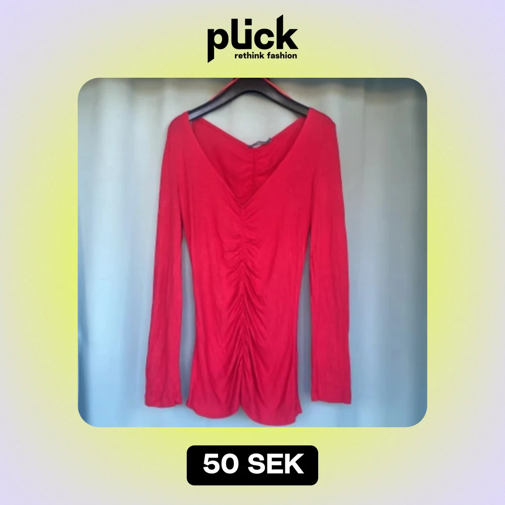 Långärmad tunn röd jumper i gott skick med v-ringad hals och rynkad både fram och i ryggen. Använd några gånger
