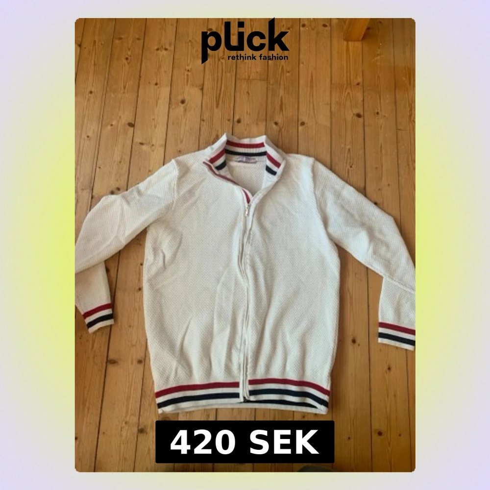 Använd 2 gånger!!!(Blir som en cardigan) Snygg vit ziptröja från Felix Hardy med ribbade muddar och krage i vitt, rött och marinblått. Tröjan har ett diskret strukturmönster och dragkedja framtill. Perfekt till jeans eller chinos för en clean look.