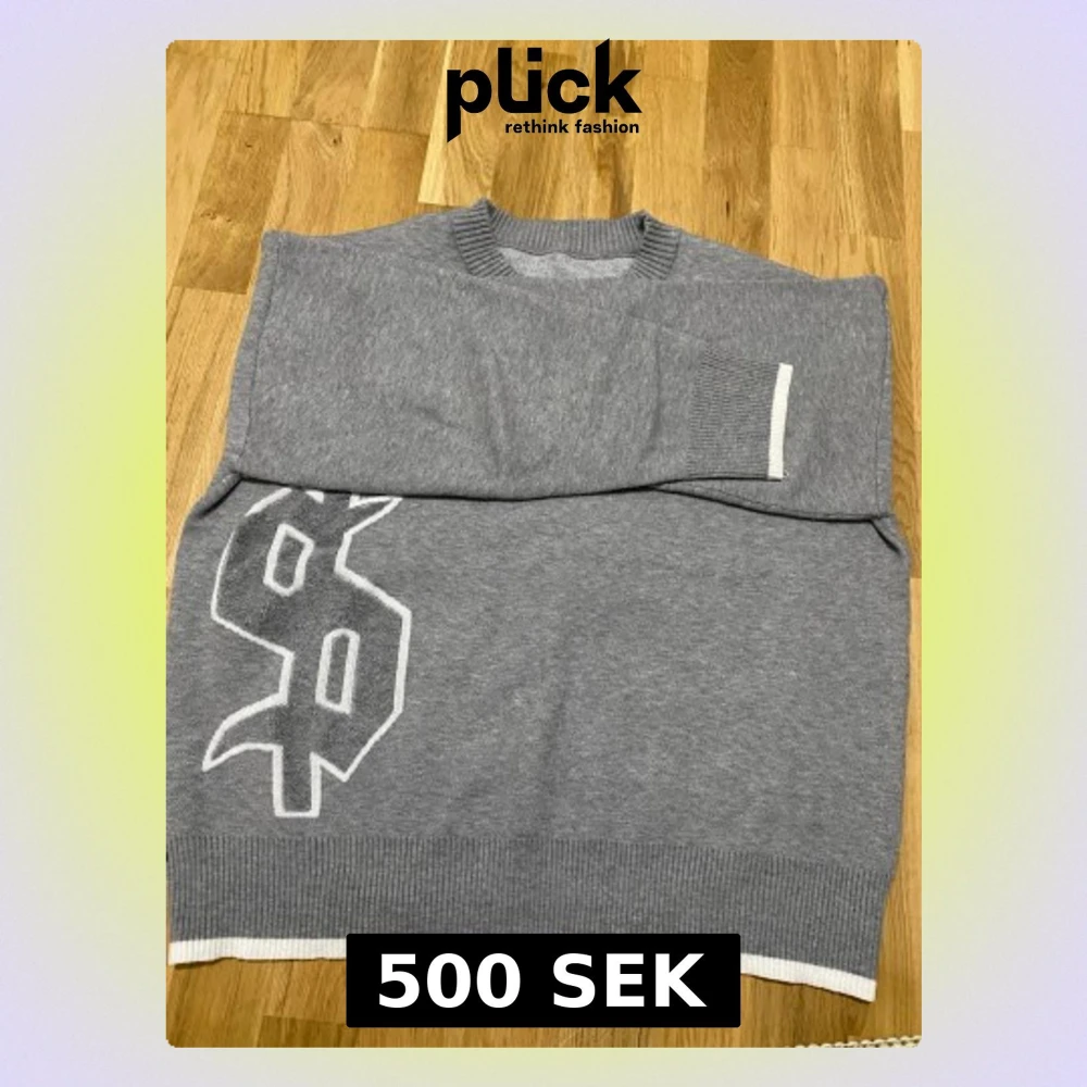 Snygg grå tröja med stort vitt dollar-tecken på framsidan. Tröjan har ribbstickade muddar och nederkant med vit detalj. Perfekt för dig som gillar streetstyle och vill sticka ut lite extra.