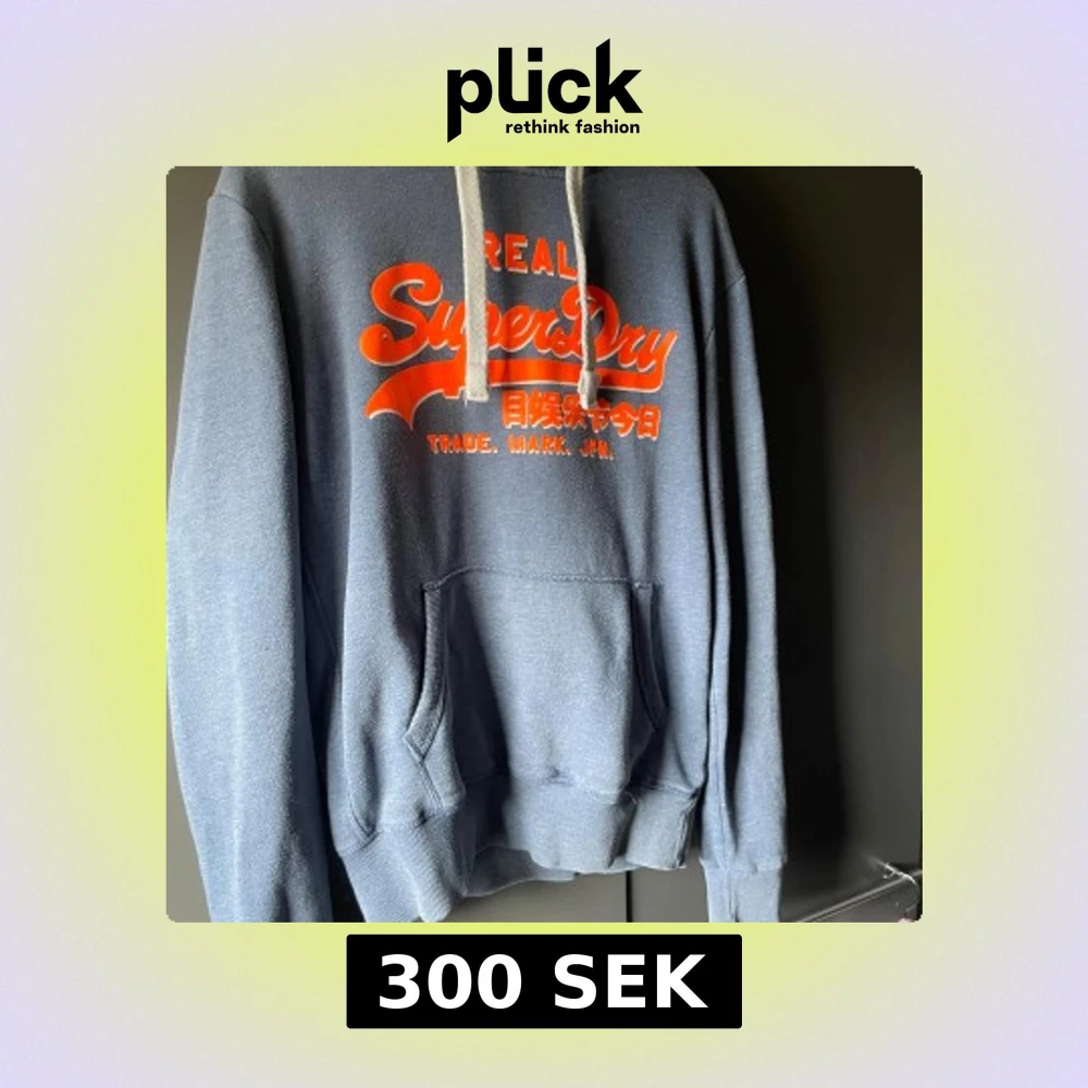 Säljer en snygg blå hoodie från SuperDry med en stor orange logga på bröstet. Tröjan har en klassisk känguruficka och vita dragsnören i huvan. Perfekt för en avslappnad stil.