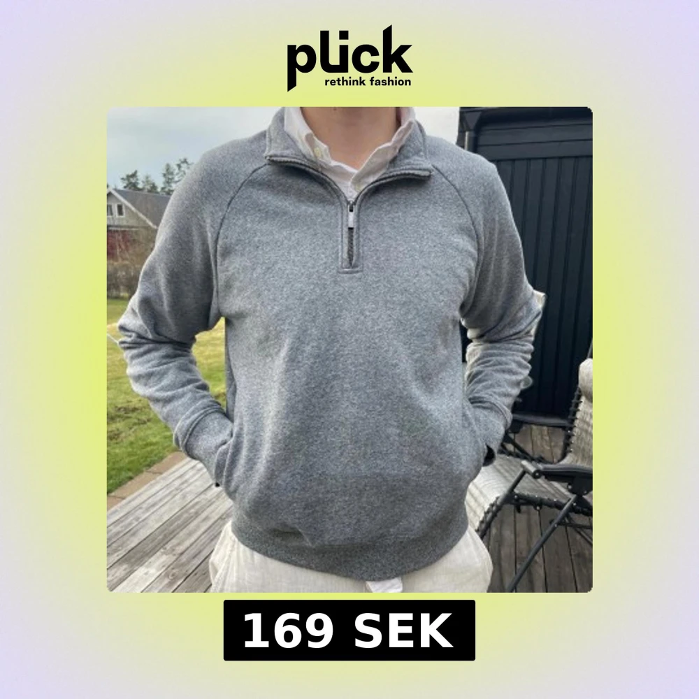 Säljer en stilren grå tröja med halv dragkedja och krage. Perfekt för en avslappnad look. Tröjan har långa ärmar och ribbade muddar vid ärmslut och nederkant. Modellen är 185cm och väger 82kg, (tröjan är lite kort för honom).
