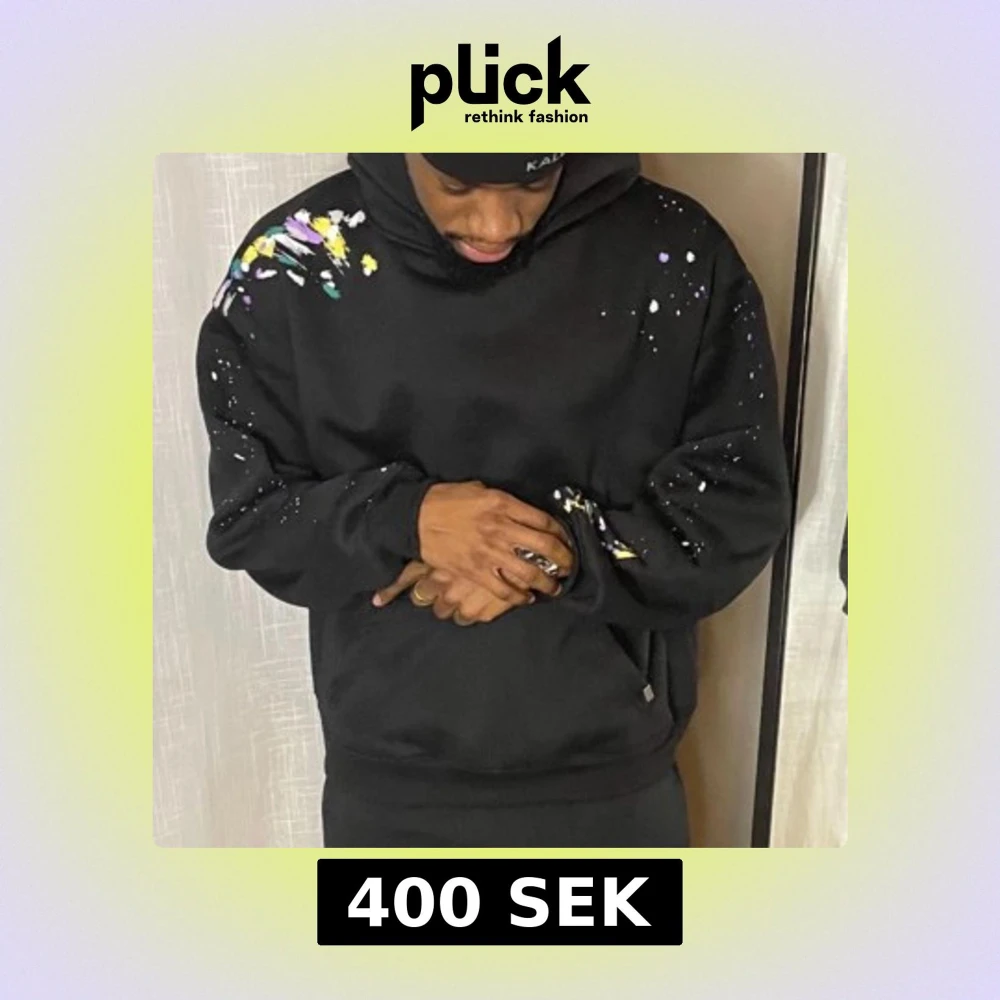 Svart hoodie med coola färgstänk i lila, vitt, gult och grönt över axlar och ärmar. Oversized passform och huva. Perfekt för dig som vill sticka ut med en unik streetstyle-look.