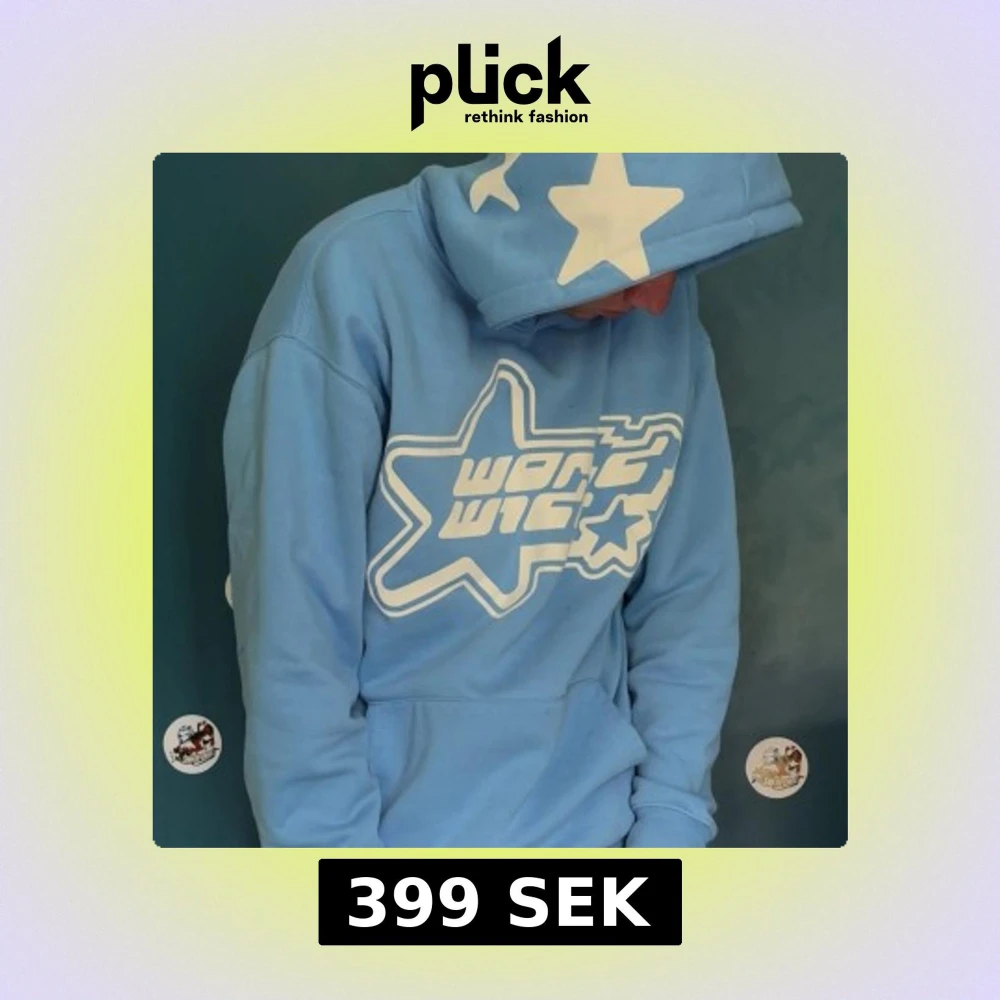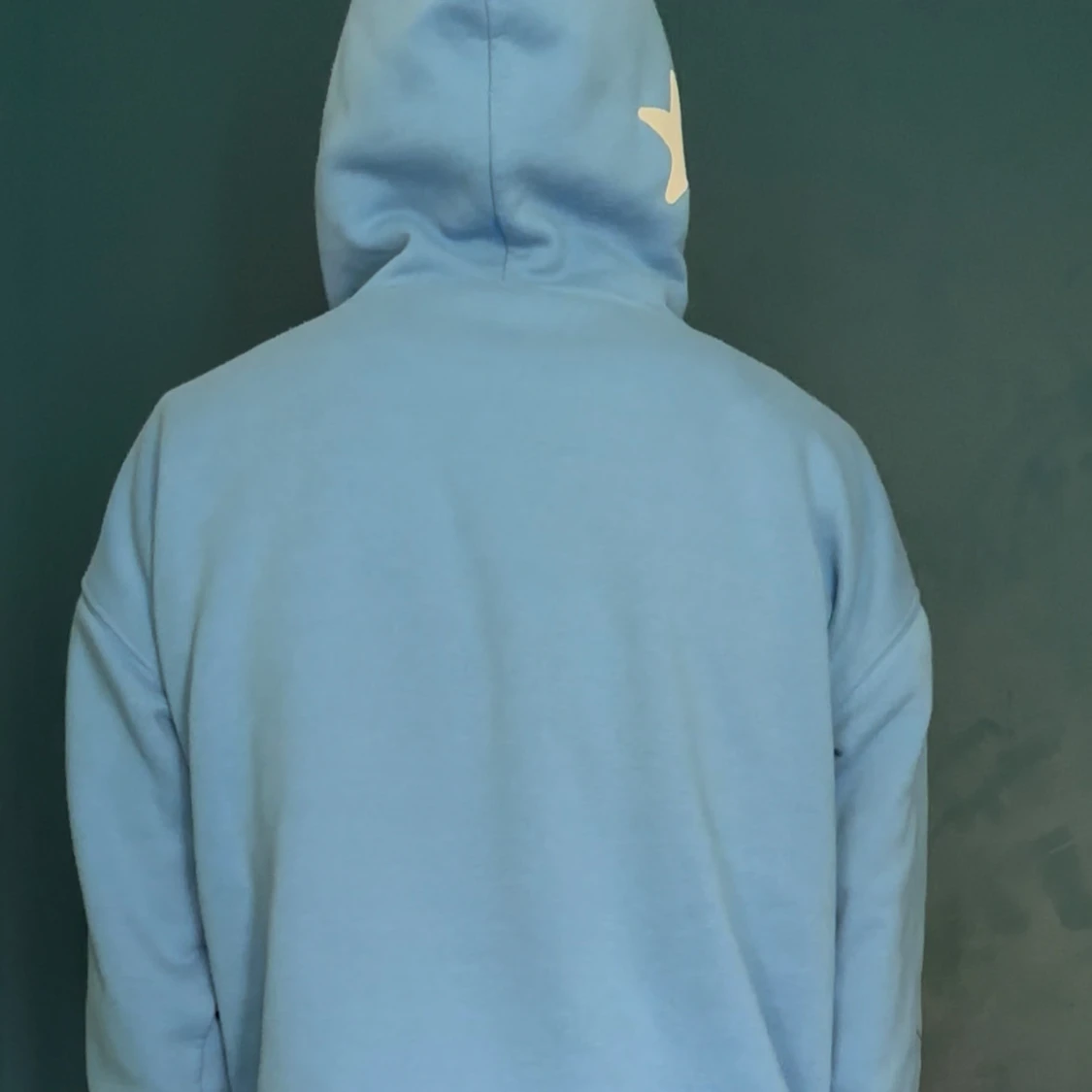 Säljer en ljusblå hoodie från World Wide med stora vita stjärnor på huvan och ett coolt vitt tryck framtill. Tröjan har huva, känguruficka och långa ärmar. Perfekt för dig som gillar streetwear och vill sticka ut med en unik design.