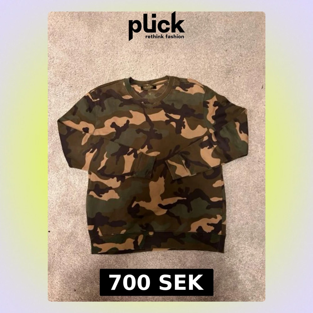 Säljer en grön och brun camouflage-mönstrad sweatshirt från Valeytino. Tröjan har rund hals, ribbade muddar och en liten nitar-detalj bak i nacken. Perfekt för dig som gillar streetwear och vill sticka ut med coolt mönster. Obs stolek L men passar M