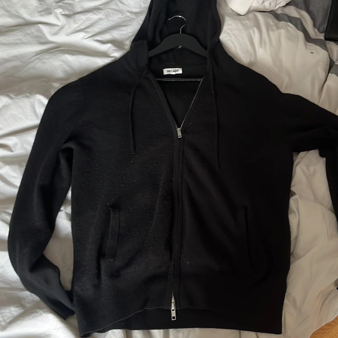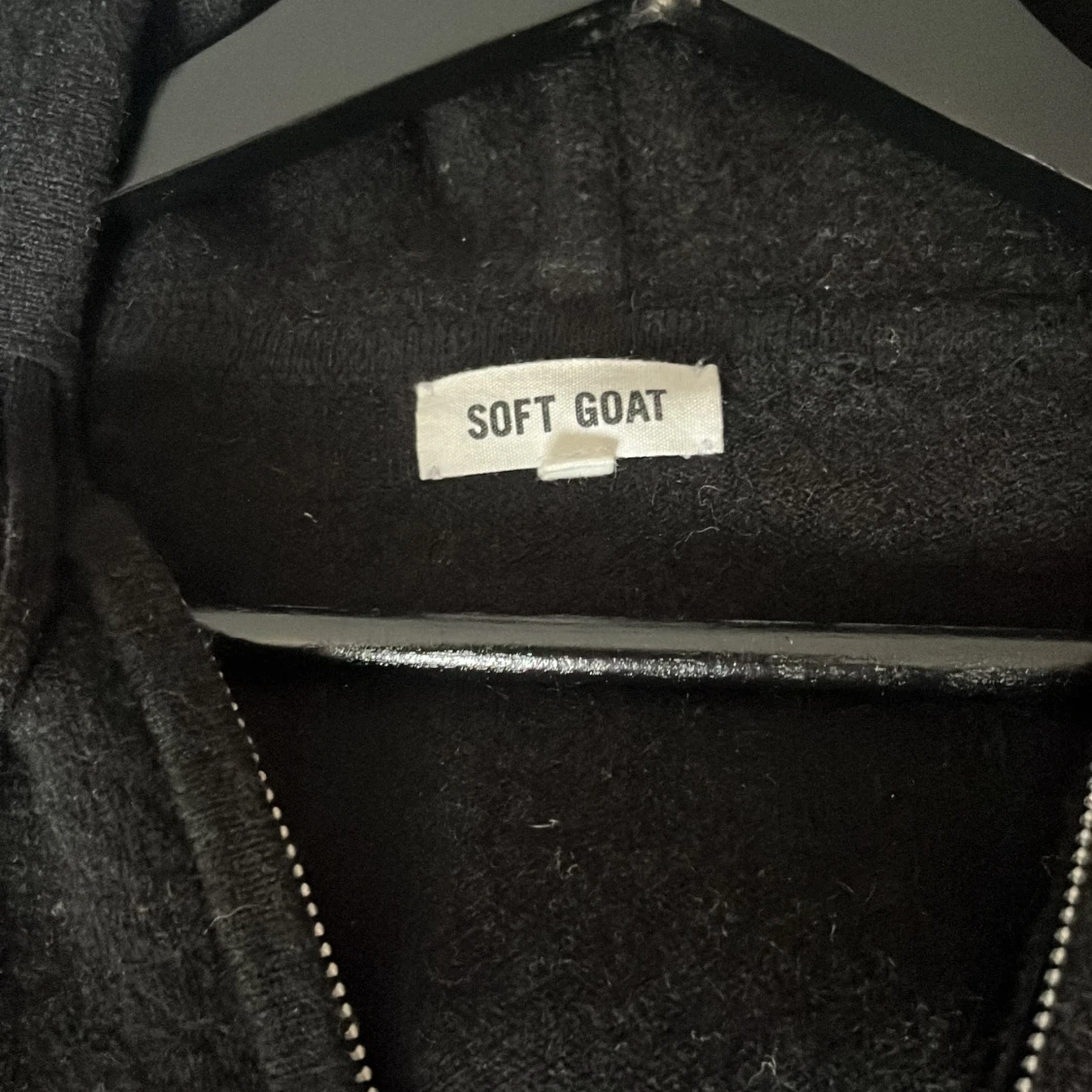 Säljer en stilren svart hoodie från Soft Goat. Den har dragkedja framtill och en bekväm huva med snörning. Perfekt för kyliga dagar och passar till det mesta i garderoben.