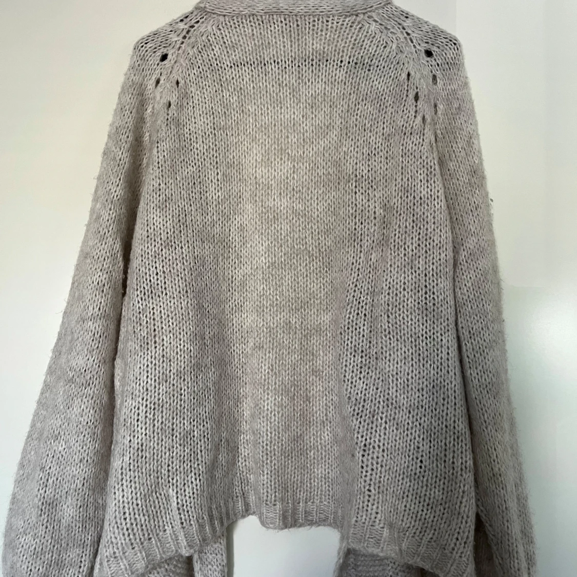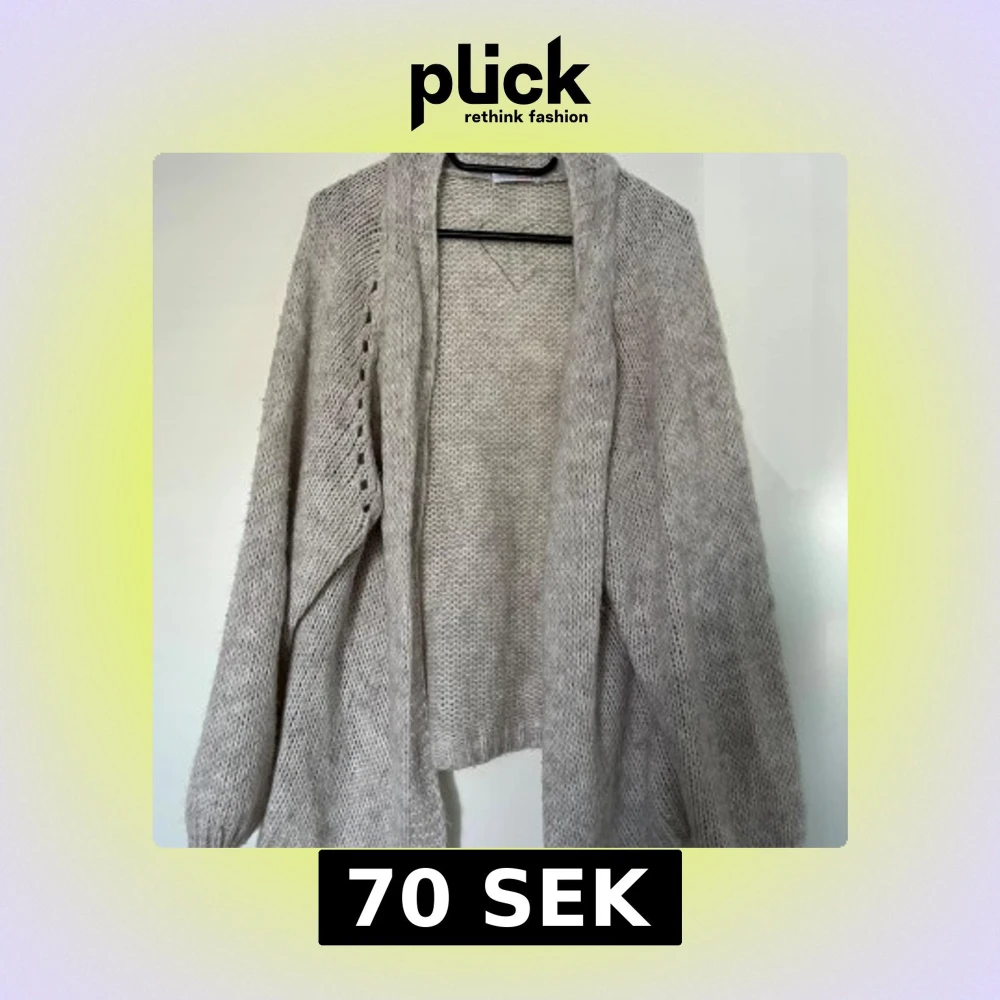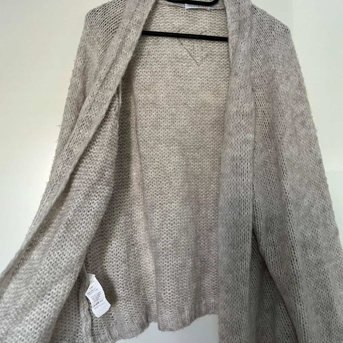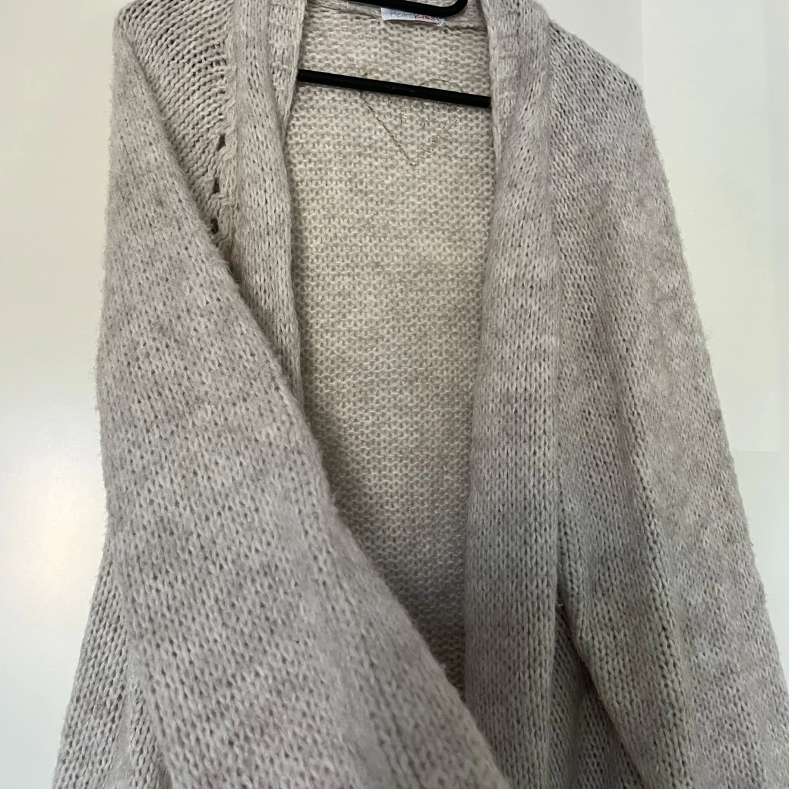 En ljusgrå stickad kofta med en öppen front och långa ärmar från märket HeartKiss. Storlek S/M. Koftan har en avslappnad passform och en mjuk textur. 57% polyacryl, 29% polyamide, 7% viskos och 7% ull. Mycket fint skick. Längd ca 47 cm.