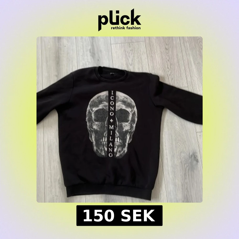 Snygg svart tröja med ett stort dödskalletryck och texten 'Icono Milano' på framsidan. Tröjan är använd flitigt därav har den defekter där de trillat av stenar från tröjan därav de billiga priset.