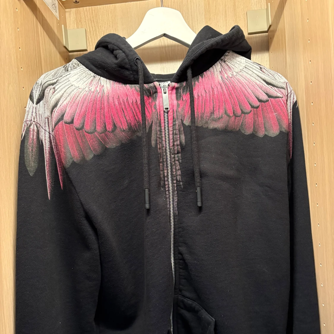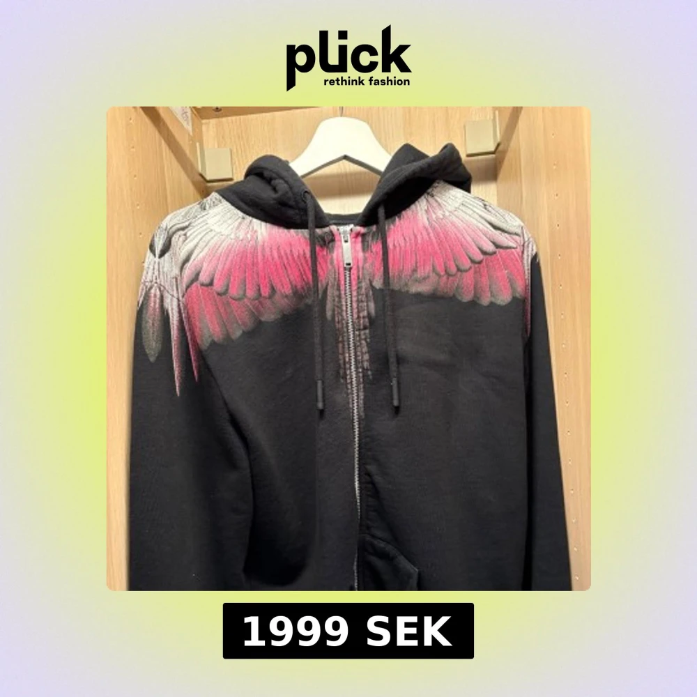 Säljer en svart hoodie från Marcelo Burlon med fett tryck av rosa och vita vingar över axlarna och ryggen. Tröjan har dragkedja framtill, huva med snörning och långa ärmar. Självklart äkta