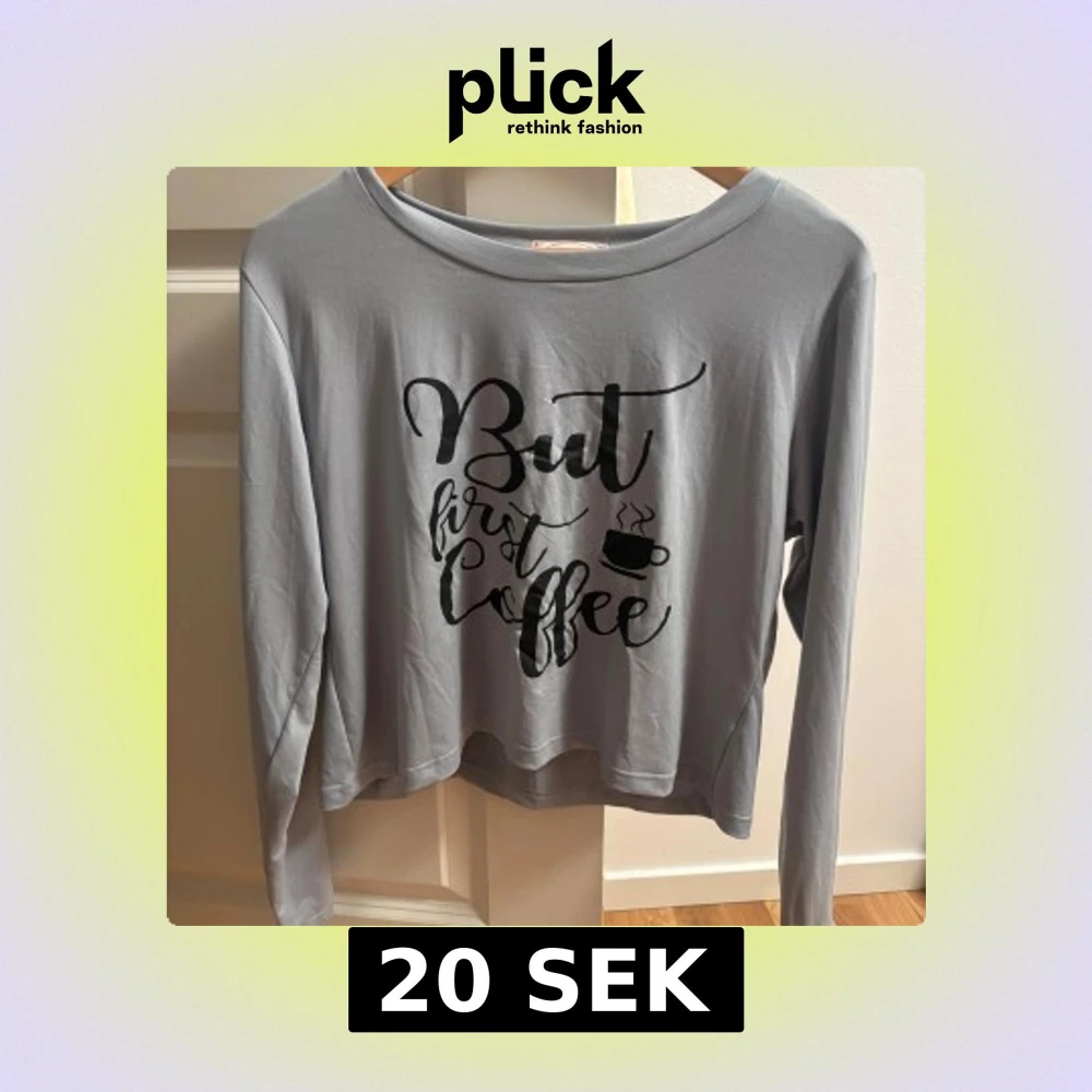 Snygg grå pyjamas långärmad tröja med svart tryck på framsidan där det står 'But first coffee' och en liten kaffekopp. Tröjan har en rund halsringning och är gjord i mjukt bomullsmaterial, perfekt för chill dagar och kaffeälskare. (En till produkt läggs till vid köp:) det blir en överraskning)