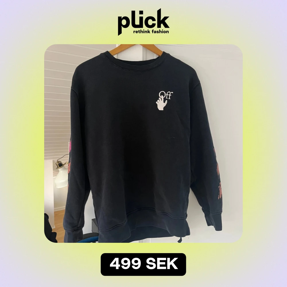 Säljer en svart sweatshirt från Off-White med coola rosa detaljer på ärmarna och ryggen. Tröjan har en avslappnad passform och är perfekt för både höst och vår. Den är i bra skick och redo för nya äventyr. Passar perfekt till jeans eller joggers för en casual look! Passar S-M