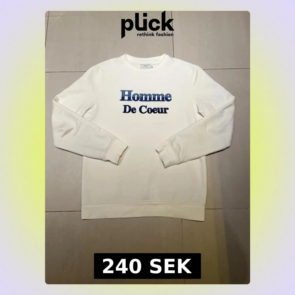 Säljer en clean vit sweatshirt från JULES i storlek M. Tröjan har trycket 'Homme De Coeur' i blått framtill och är gjord i mjuk bomull. Klassisk rund halsringning och långa ärmar. Perfekt för dig som gillar stilrena plagg med en twist.