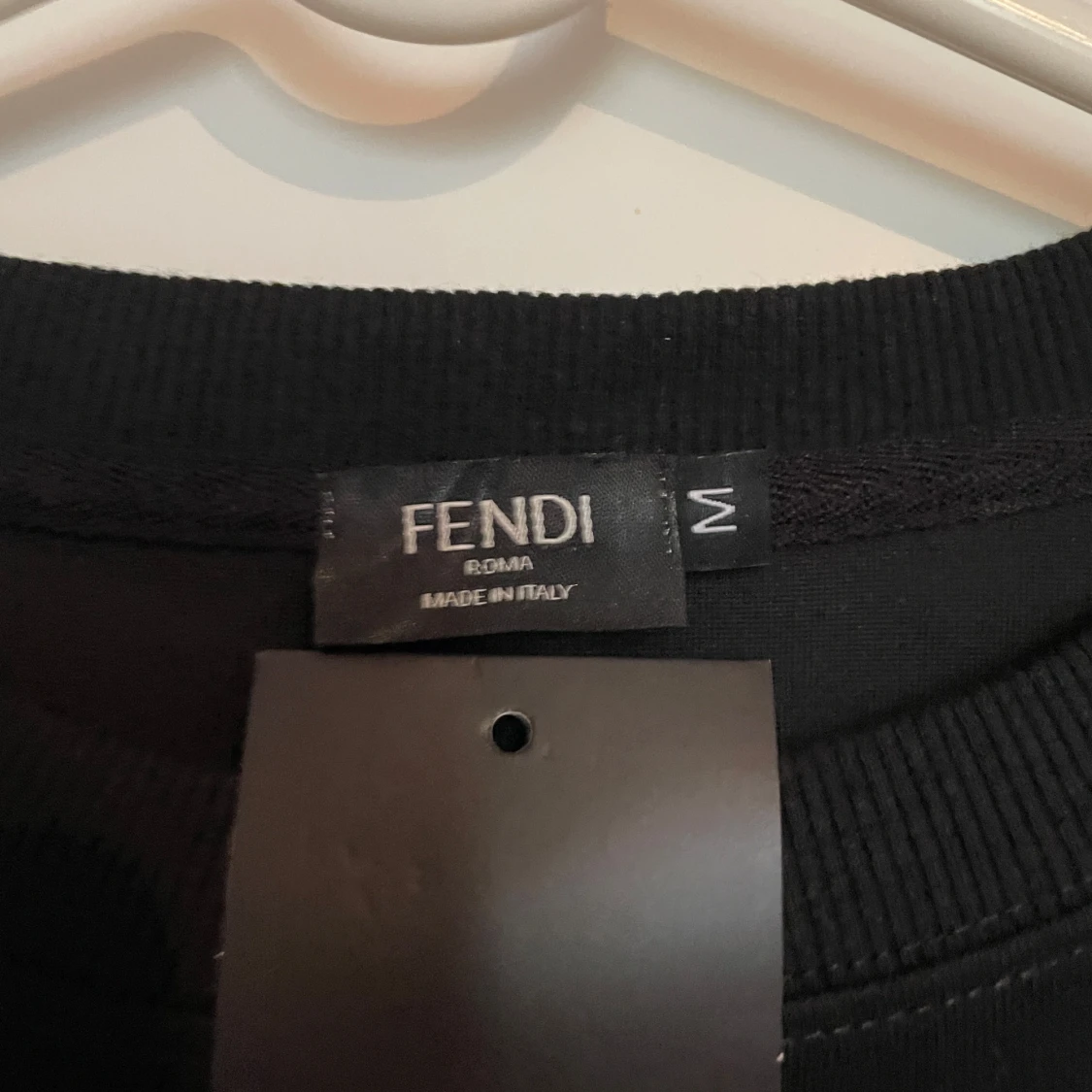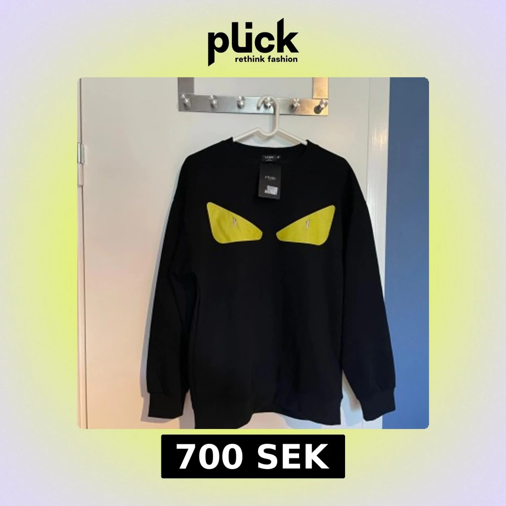 Cool svart tröja från Fendi med ikoniska gula ögon framtill. Tröjan har rund hals, långa ärmar och en relaxed passform. Perfekt för dig som vill sticka ut med en statement piece från ett lyxigt märke. Pris kan diskuteras vid snabb affär! Tar emot byten👌