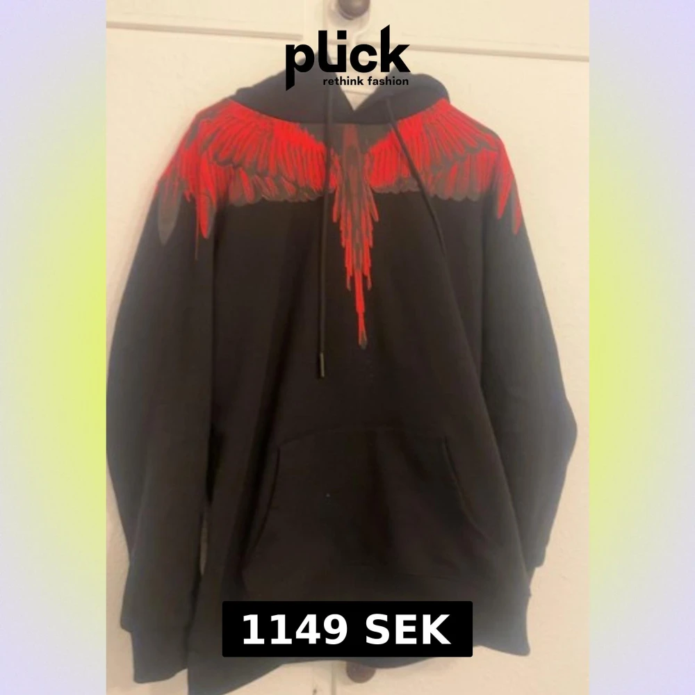 Svart hoodie med huva och känguruficka, dekorerad med ett fett rött vingmönster över axlarna och ryggen. Snyggt tryck som ger street vibe, perfekt för dig som gillar att sticka ut. Mjuk och skön, med dragsko i huvan.