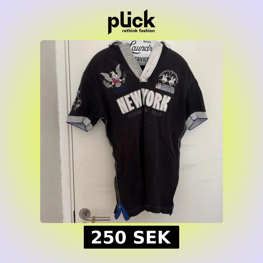 Svart pikétröja med vita och blå detaljer, stora broderade tryck fram och bak med texten 'New York' och olika märken på ärmarna. Krage i vitt och knappar framtill. Snygga kontrastdetaljer och sportig känsla.