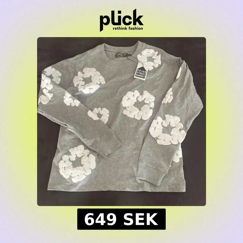 Säljer en grå långärmad tröja från Denim Tears med vita blommor tryckta över hela tröjan. Tröjan har rund halsringning och är perfekt för dig som gillar unika prints. Märkt med Dover Street Market-tag. Den är oanvänd då jag inte tyckte om den och är i storlek M. Pris går även att diskuteras!