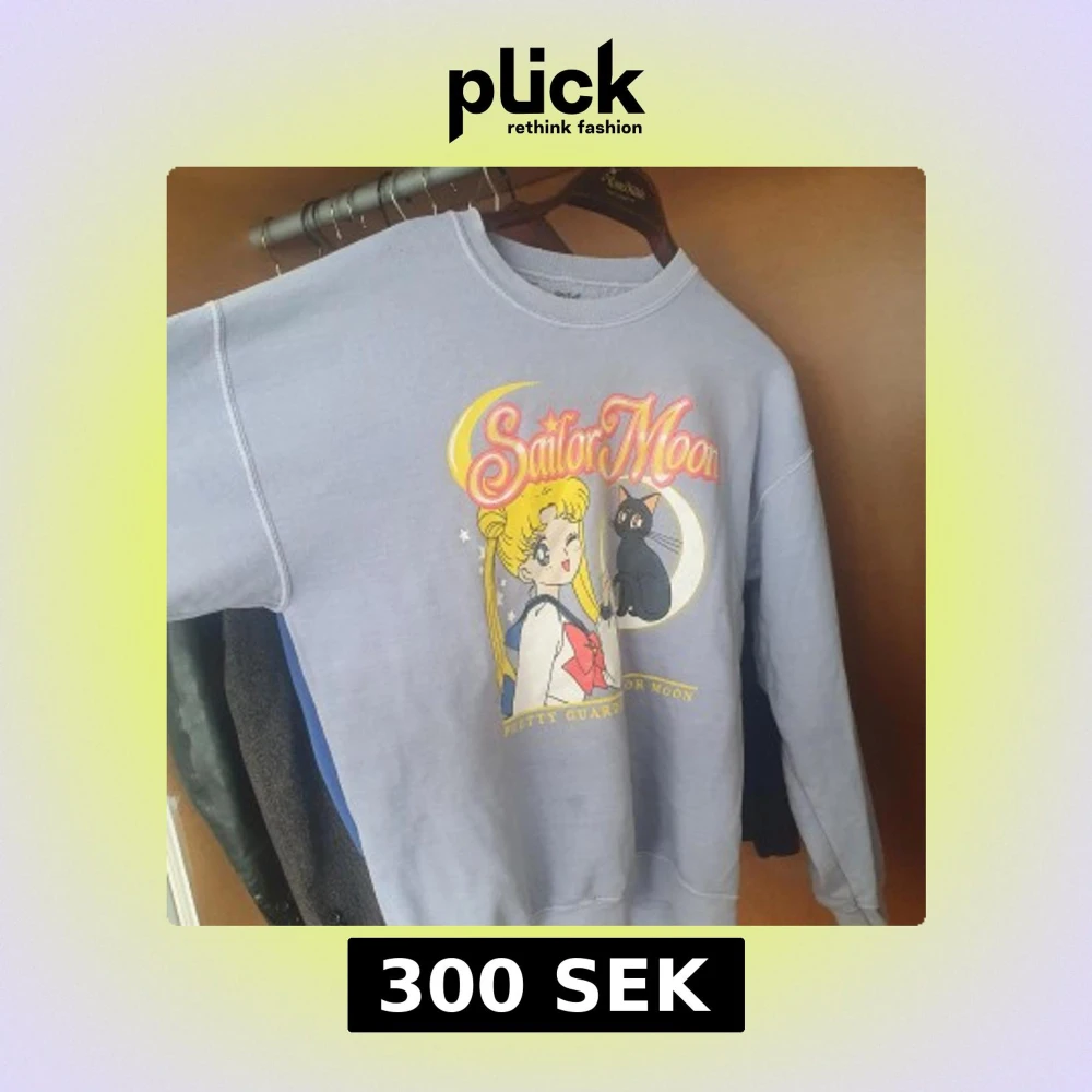 Säljer en grå sweatshirt med ett färgglatt Sailor Moon-tryck på framsidan. Tröjan har en rund halsringning och långa ärmar. Perfekt för fans av serien!
