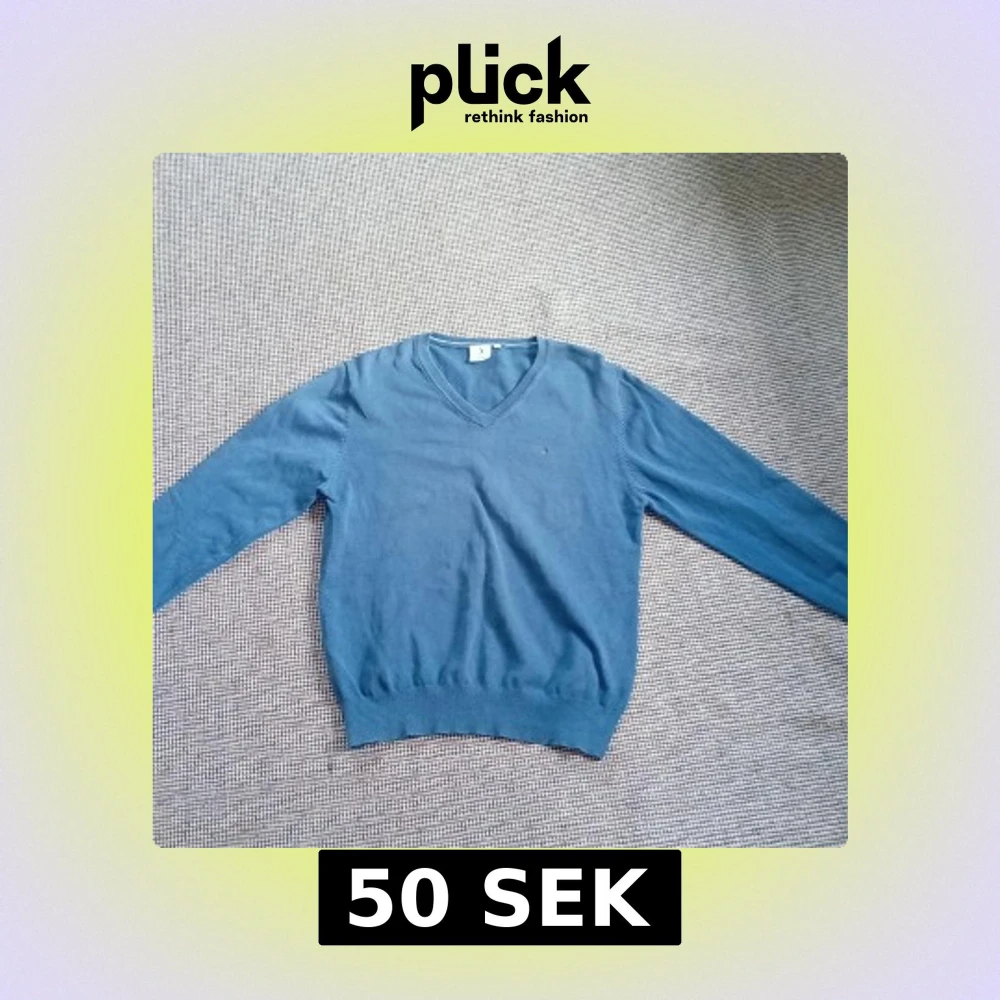 Säljer en stilren blå v-ringad tröja med ett litet broderat märke på bröstet. Tröjan har långa ärmar och ribbade kanter vid ärmslut och nederkant. Perfekt för en avslappnad look.