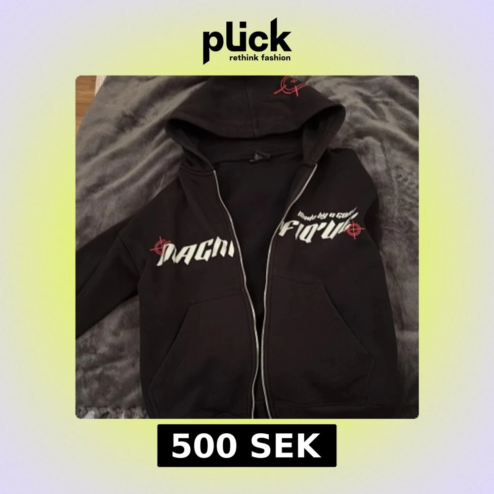Svart hoodie med luva från MAGNIFIQUE, tryck på framsidan och baksidan och även luvan. Väldigt bra skick och kan gå ner i pris vid snabb affär