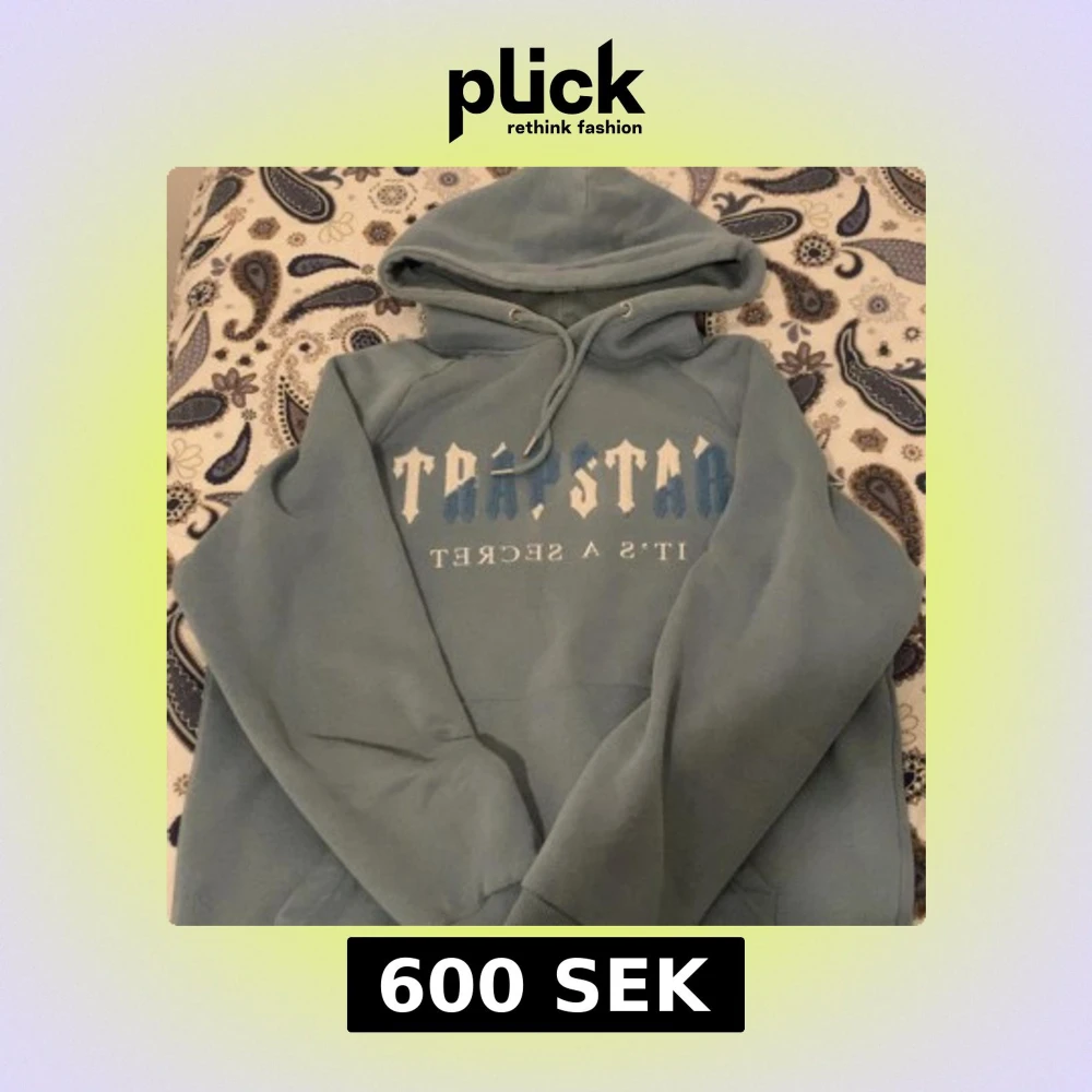Säljer en ljusblå hoodie från Trapstar med vit och blå text på bröstet. Tröjan har huva med snörning och en stor magficka. Perfekt för dig som gillar streetwear och vill ha en chill look.