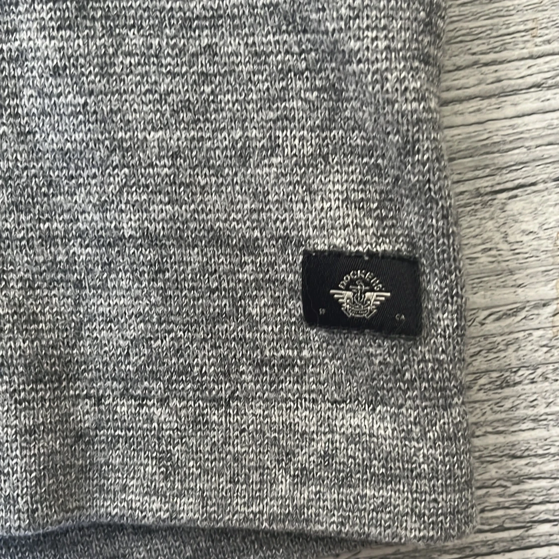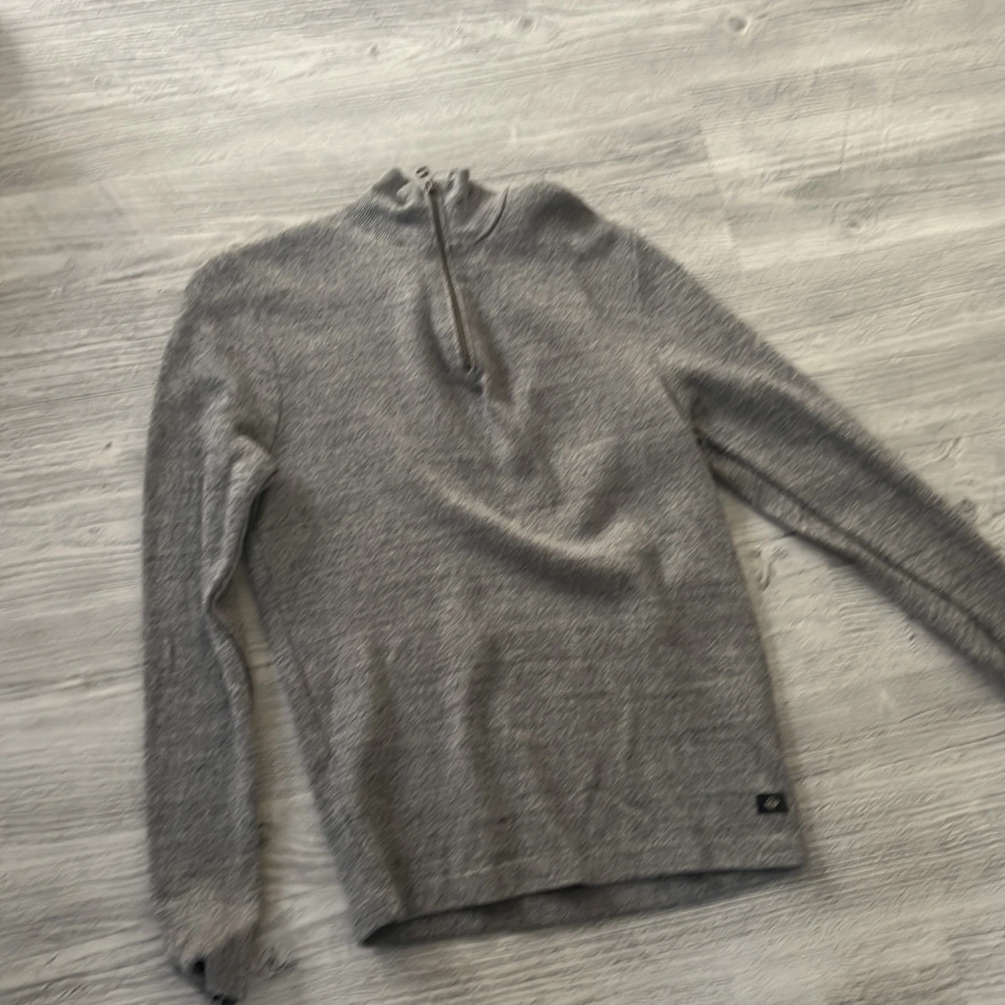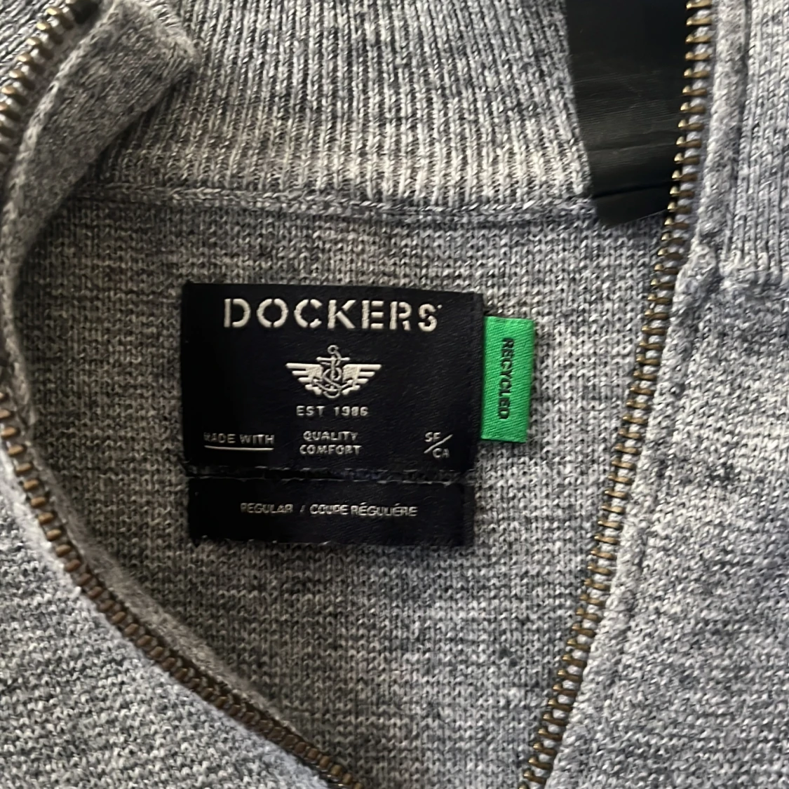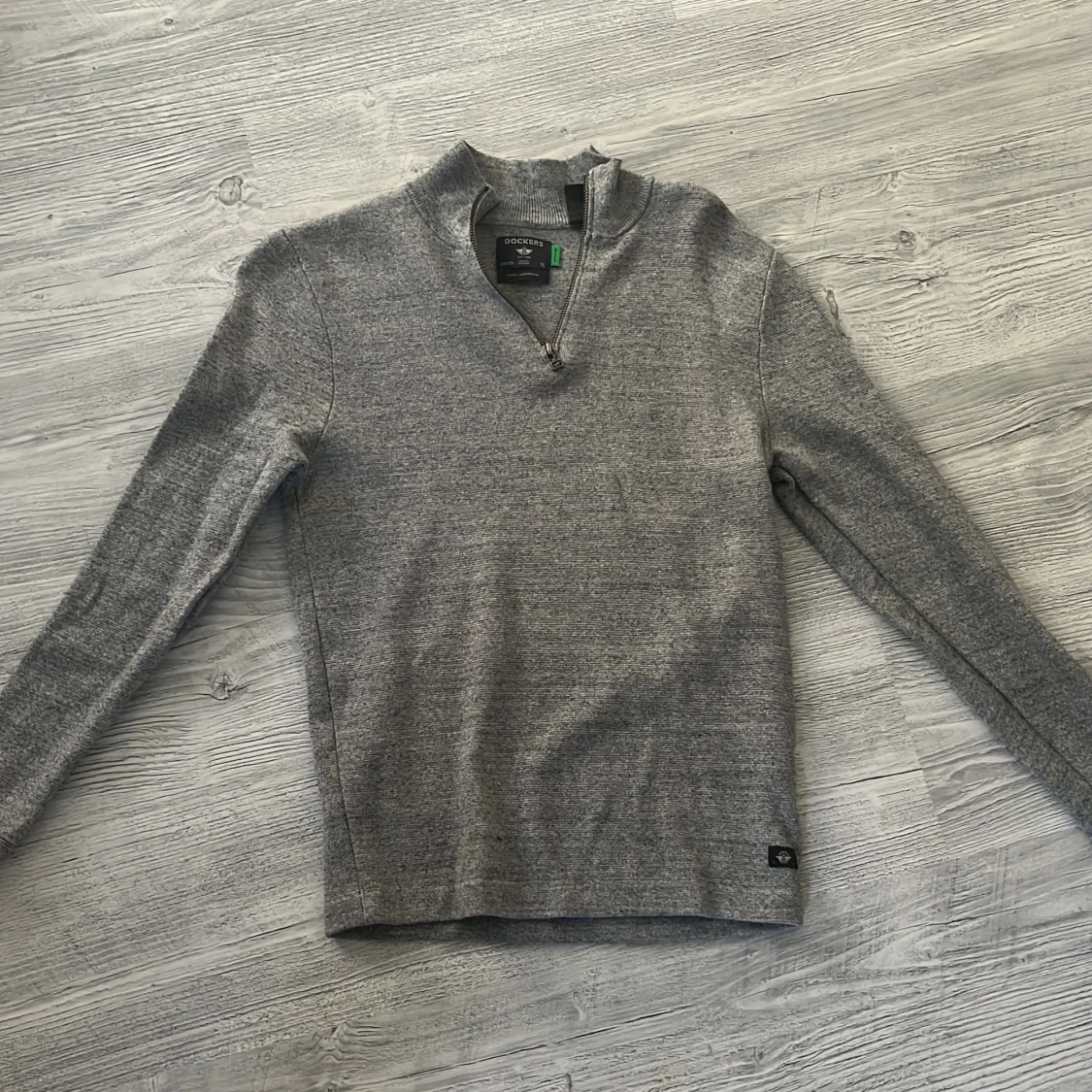 Snygg grå stickad tröja från Dockers med half zip-dragkedja och hög krage. Tröjan har lång ärm och en liten svart logolapp nertill. Perfekt för lager-på-lager och chill stil. Regular fit och mjukt material. Använd max 3 gånger skicket är suveränt!