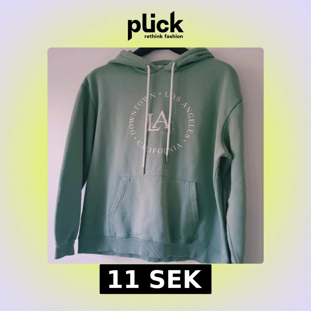 Snygg ljusgrön hoodie med vit LA-print och texten Downtown Los Angeles California på bröstet. Tröjan har huva med vita snören och en stor magficka. Perfekt för chill dagar och streetstyle. Mjuk och skön i bomullsmix, normal passform och långa ärmar. Helt skick dock obehandlade fläckar (se extra bild)