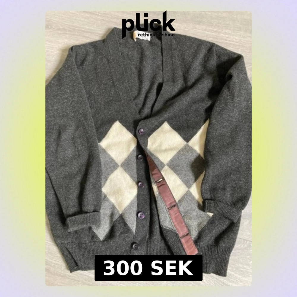 Kofta i mörkgrå ull från Pringle, tillverkad i Skottland. Klassisk argylemönstring i vitt och ljusgrått framtill, lila knappar och ribbade muddar. Perfekt för dig som gillar retrostil och vill ha något riktigt mysigt och tidlöst.