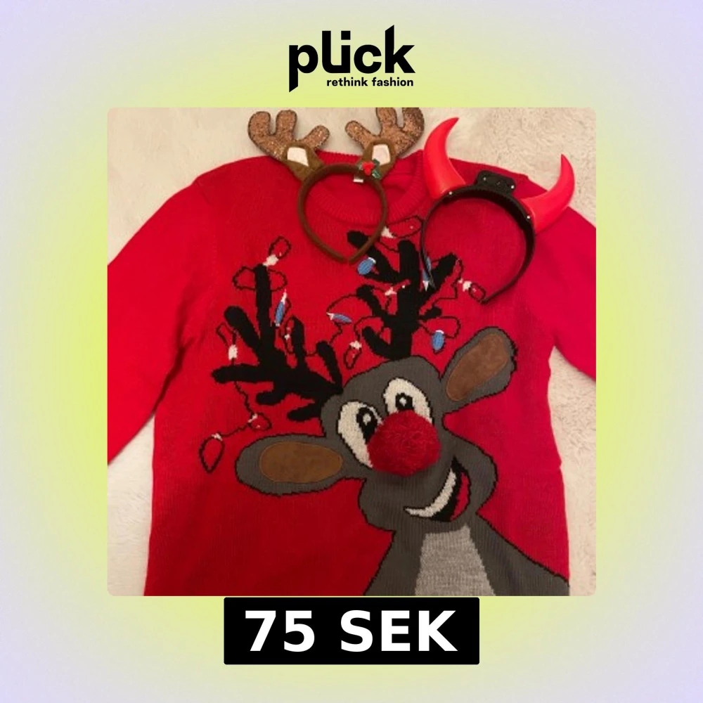 Rolig röd jultröja med stort motiv av en ren med julbelysning i hornen och en fluffig röd nos. Tröjan har rund hals och långa ärmar. Perfekt för att sticka ut på julfirandet!