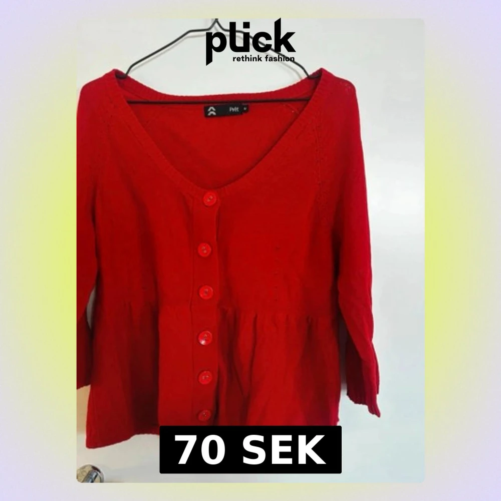 Snygg röd kofta från Petit med v-ringning och stora matchande knappar framtill. Koftan har lång ärm och en lätt utställd passform nedtill. Perfekt för dig som vill ha en färgklick i garderoben. Materialet känns mjukt och bekvämt. Rök och djurfritt hem. Pruta gärna!🌸