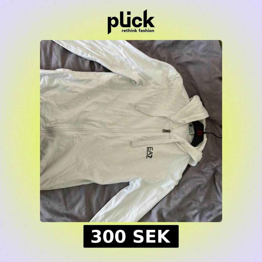Säljer en stilren vit huvtröja från EA7 med dragkedja och huva. Perfekt för en avslappnad look. Den är rätt tunn så den e perfekt för en vår/sommar dag.