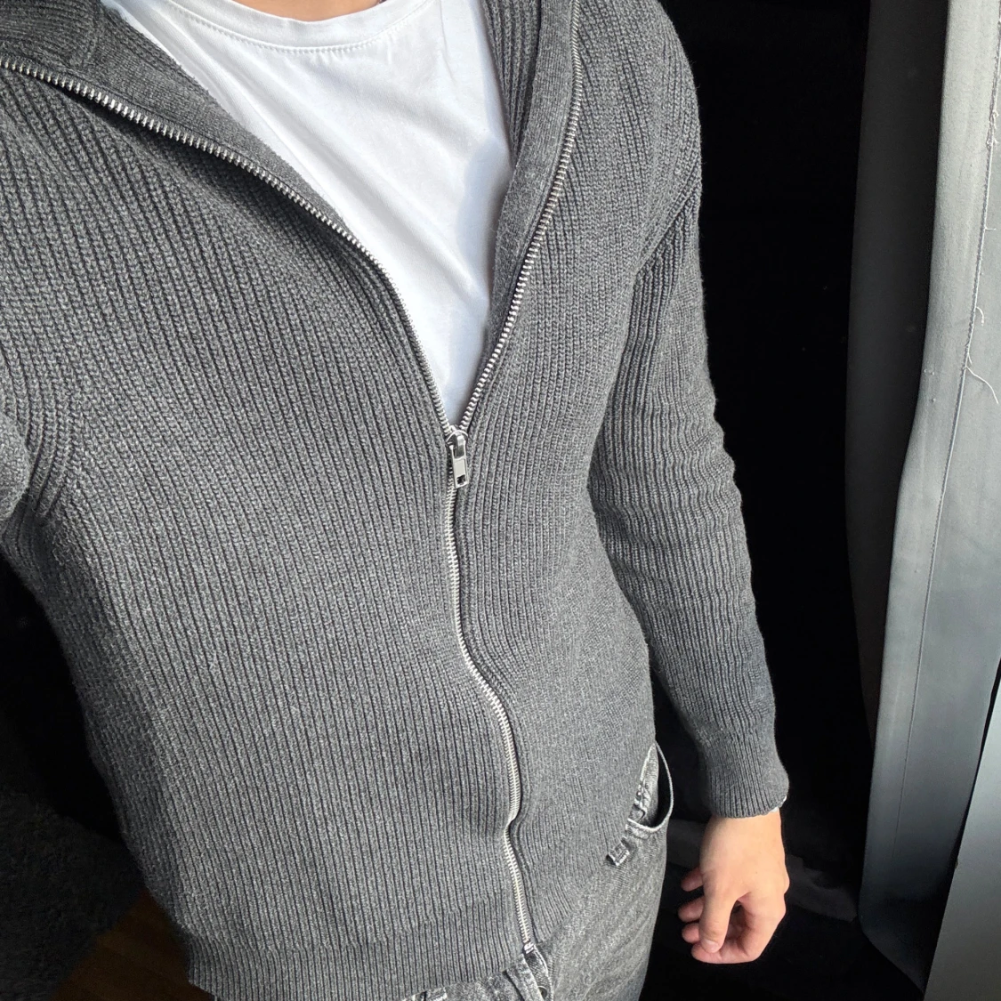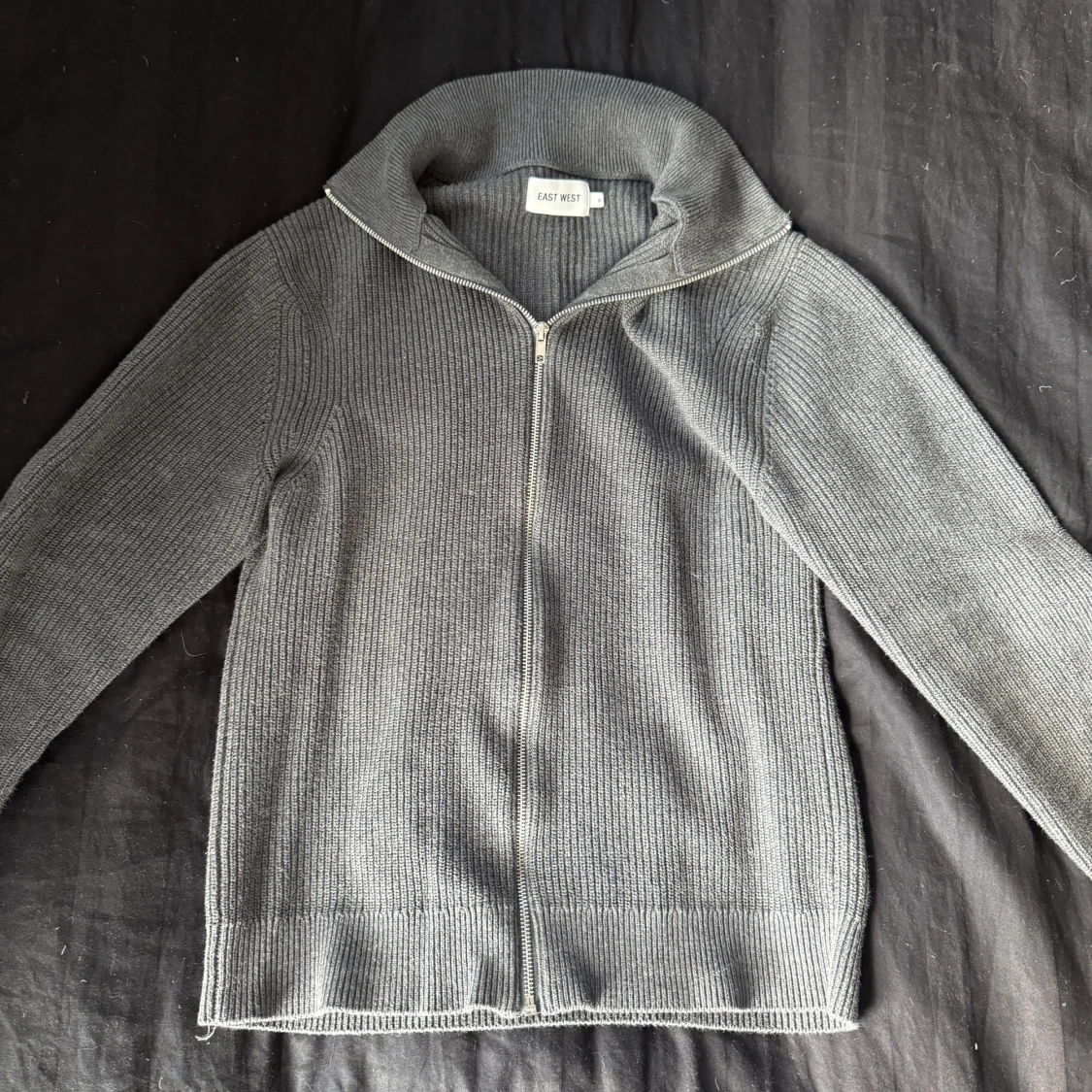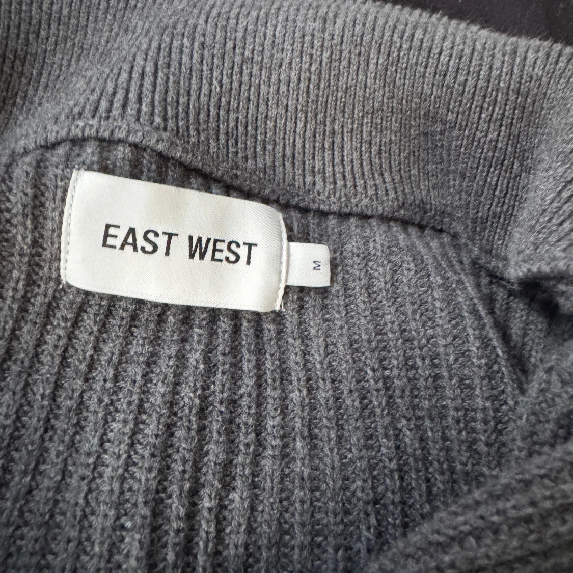 Säljer en grå stickad kofta från East West i storlek M. Koftan har hel dragkedja framtill, ribbad struktur och hög krage. Perfekt för lager-på-lager och funkar till både jeans och chinos. Enkel och stilren design som passar till många outfits.