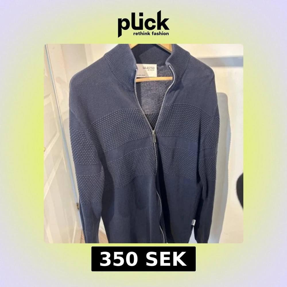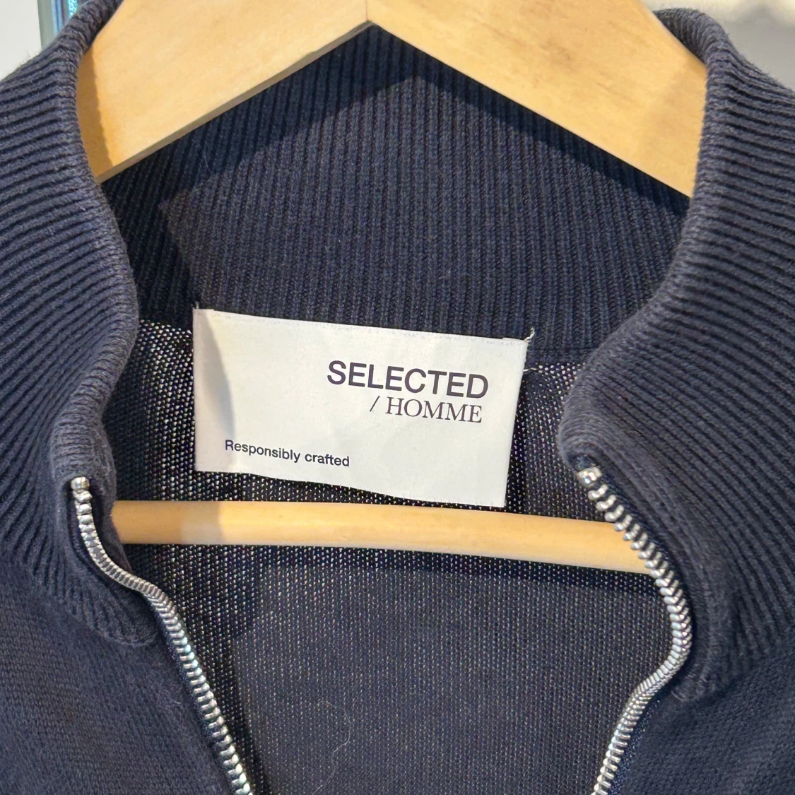 Snygg mörkblå kofta från Selected Homme med dragkedja framtill och ribbad krage. Tröjan har ett coolt strukturerat mönster på bröstet och ärmarna, samt långärmad passform. Perfekt för dig som gillar stilrena och bekväma plagg.