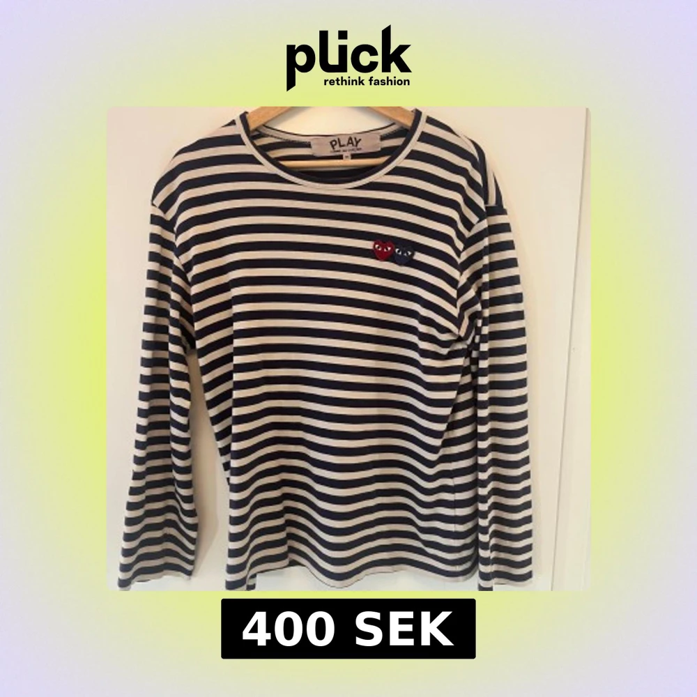 Säljer en klassisk långärmad tröja från Comme des Garçons Play med marinblå och vita ränder. Tröjan har ett broderat hjärta på bröstet och rund halsringning. Perfekt för en stilren och avslappnad look.