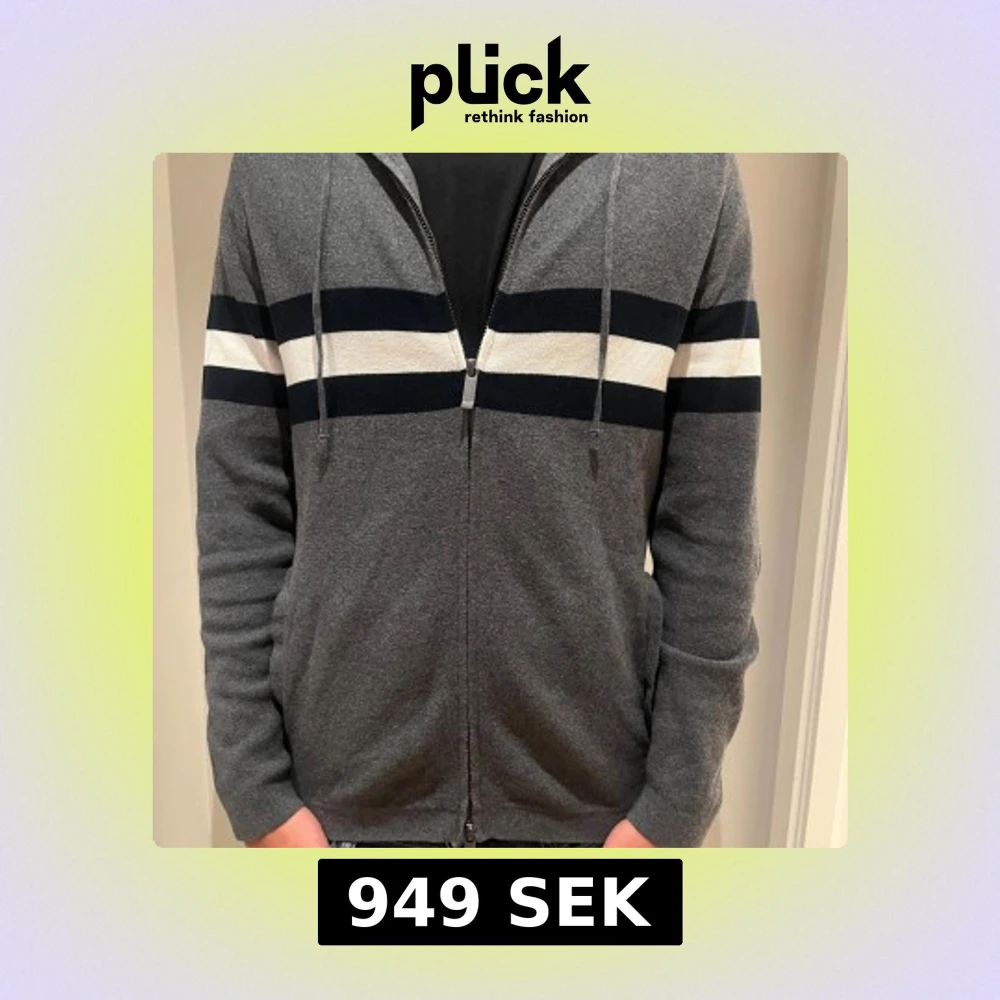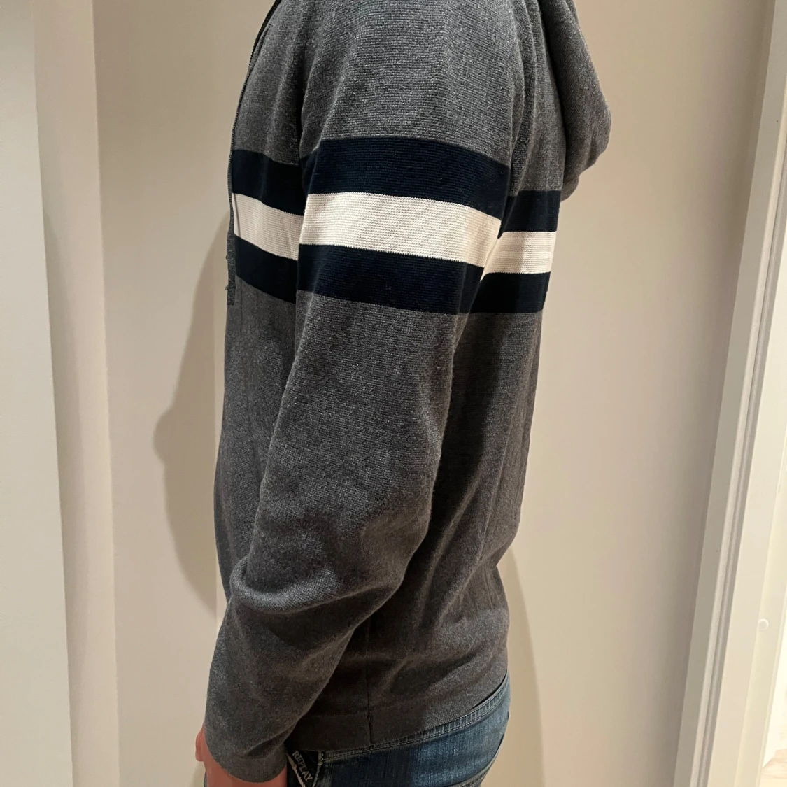 Grå hoodie med svarta och vita horisontella ränder över bröstet. Tröjan har huva med snörning, hel dragkedja framtill och långa ärmar. Perfekt för en chill och avslappnad stil. Nästan som ny, aldrig använd.