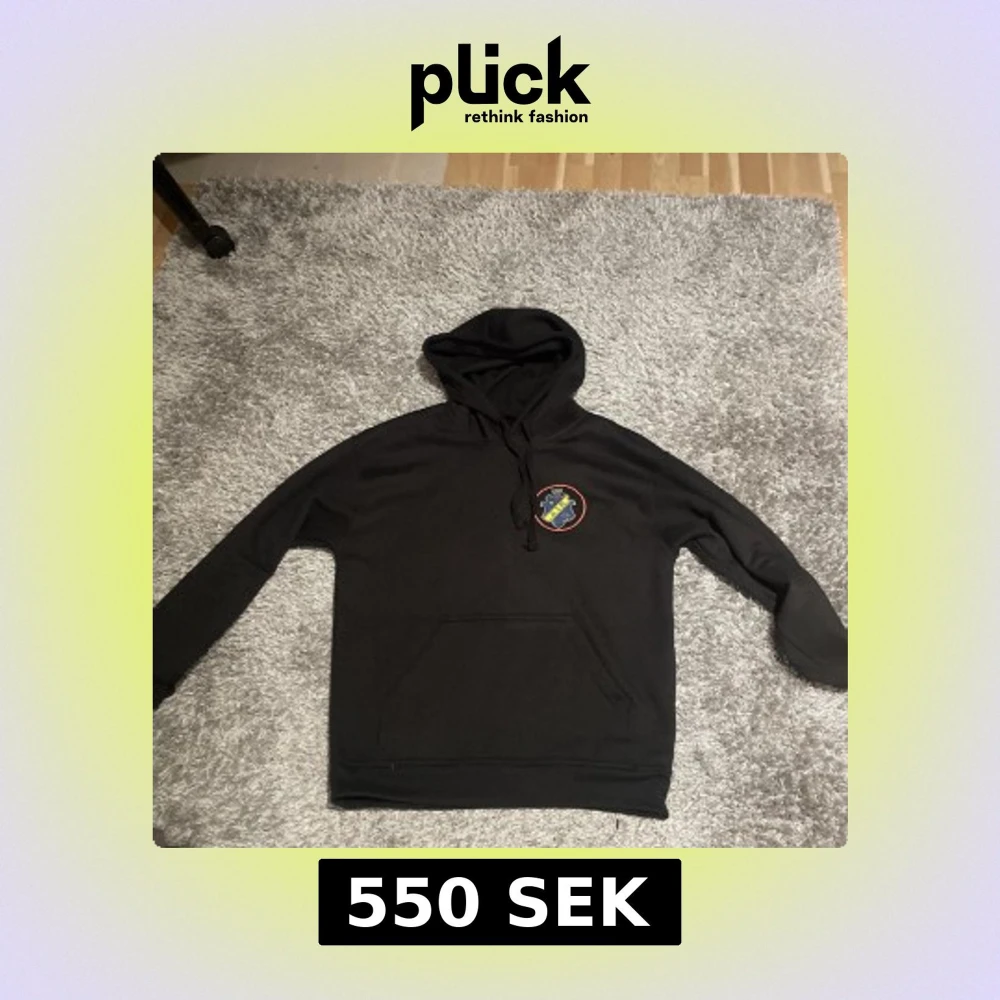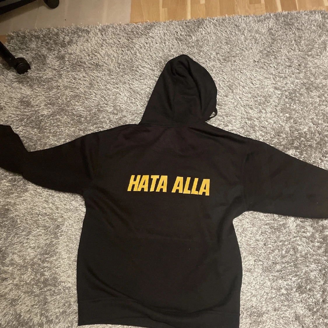 Svart hoodie med huva och snörning, stor magficka och tryck på bröstet samt stort gult tryck 'HATA ALLA' på ryggen. Perfekt för dig som vill sticka ut. Mjuk och skön, i bomull. Hör av er vid frågor & funderingar