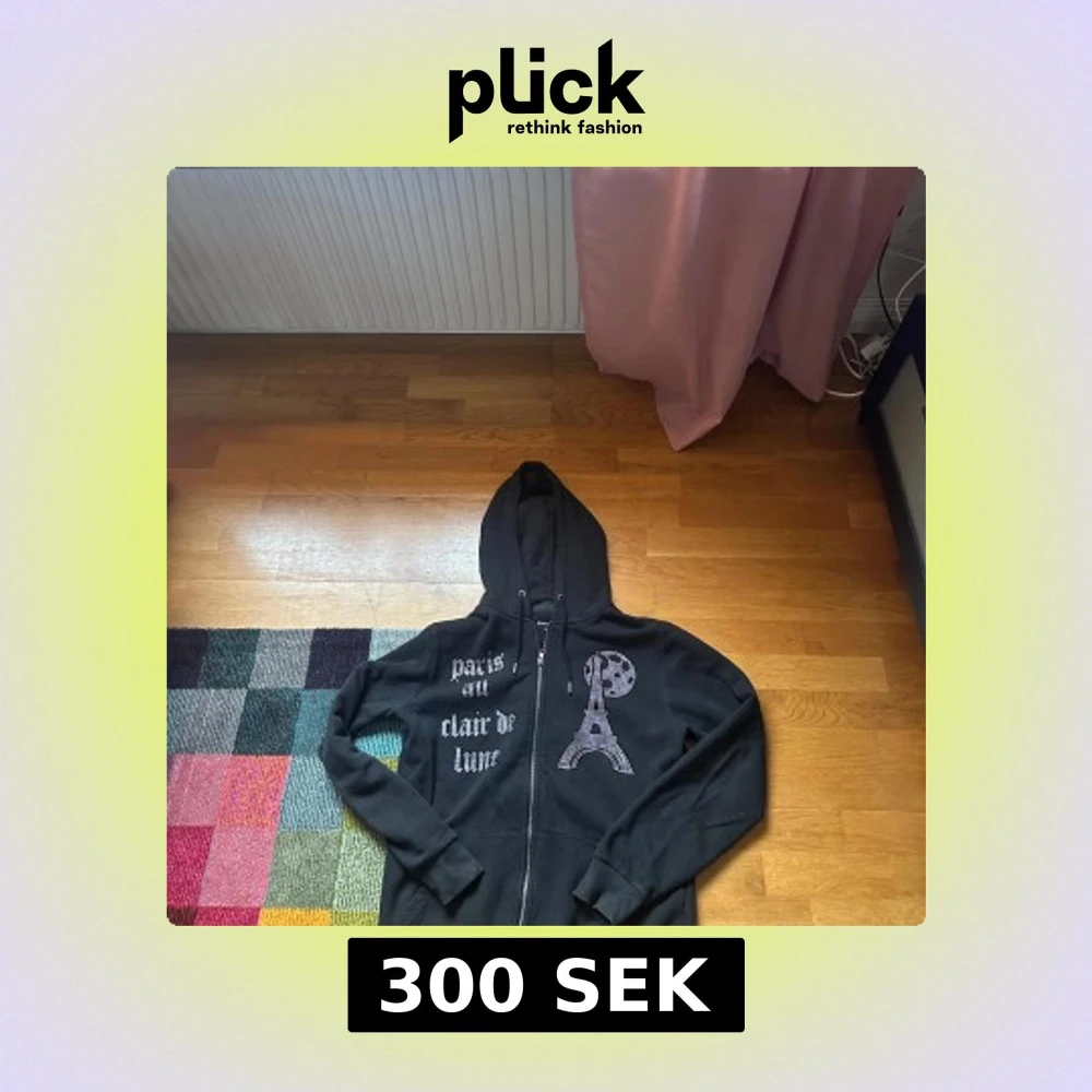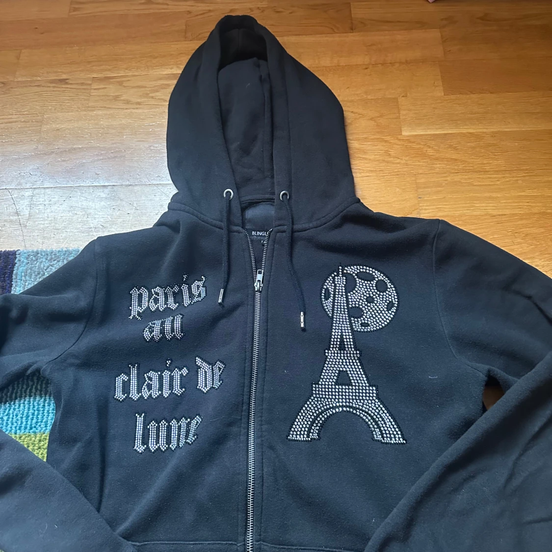Svart hoodie från BLINGLUCID med dragkedja, huva och snörning. Framsidan har strassdetaljer med texten 'paris au clair de lune' och motiv av Eiffeltornet och månen. Perfekt för dig som gillar statement-plagg med bling.