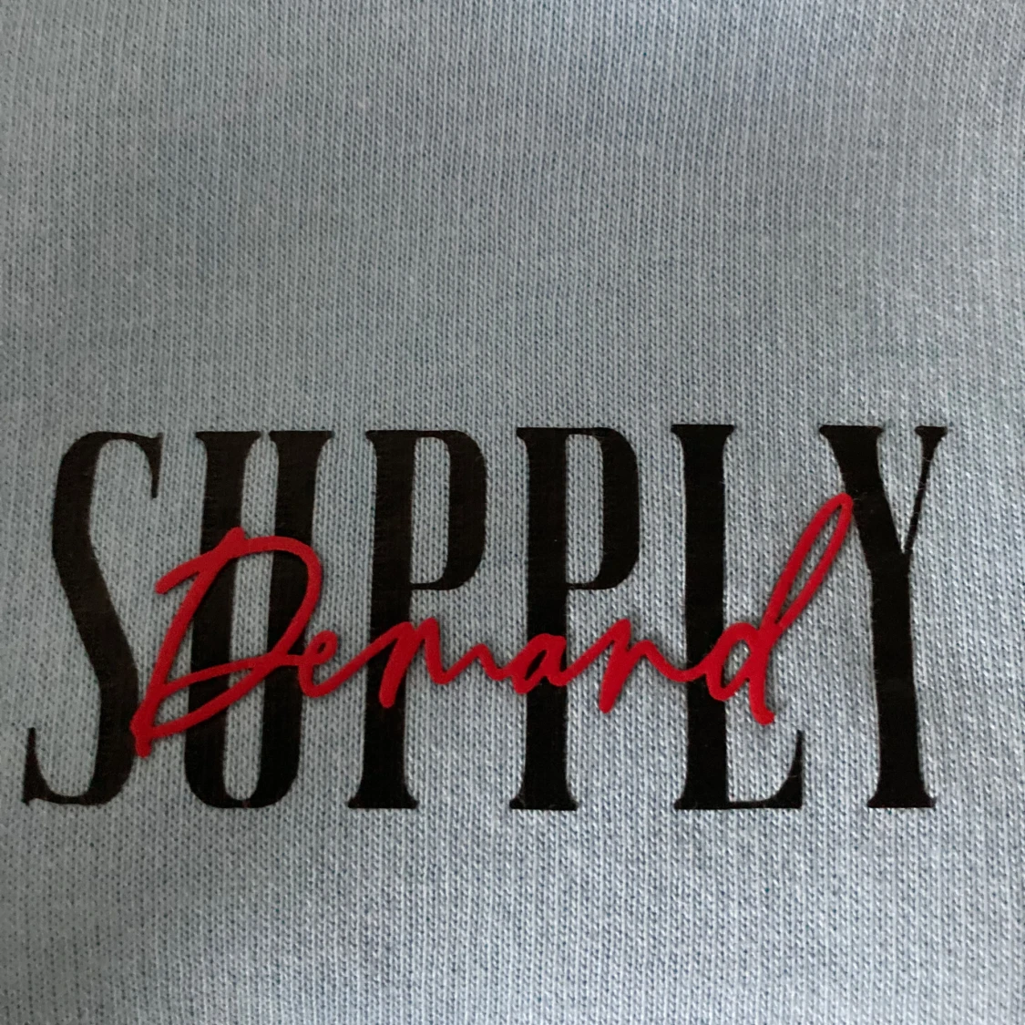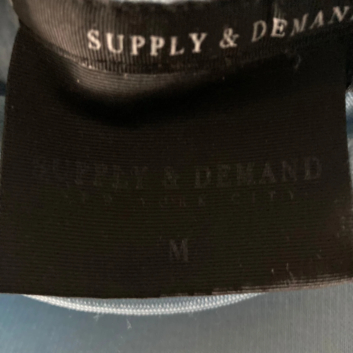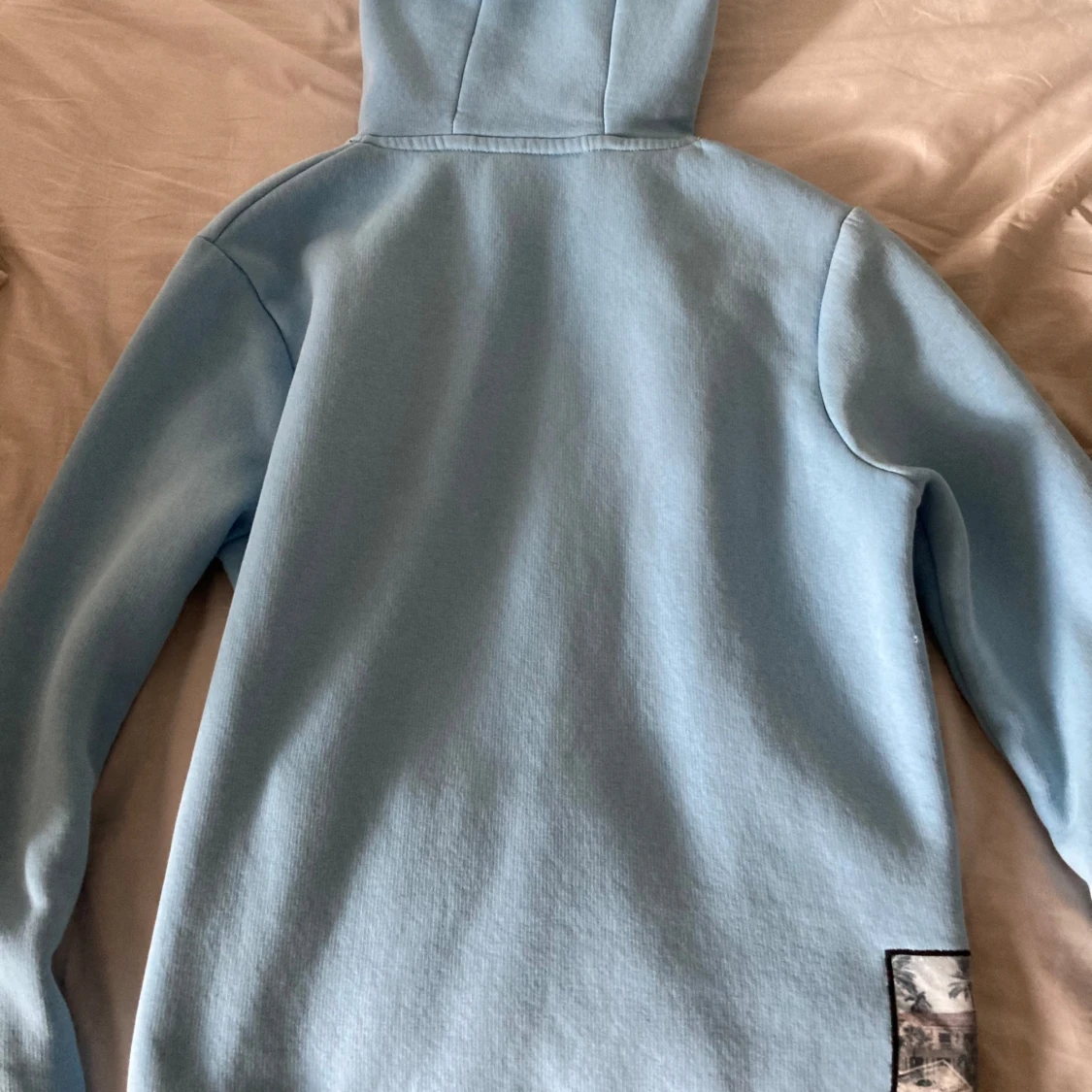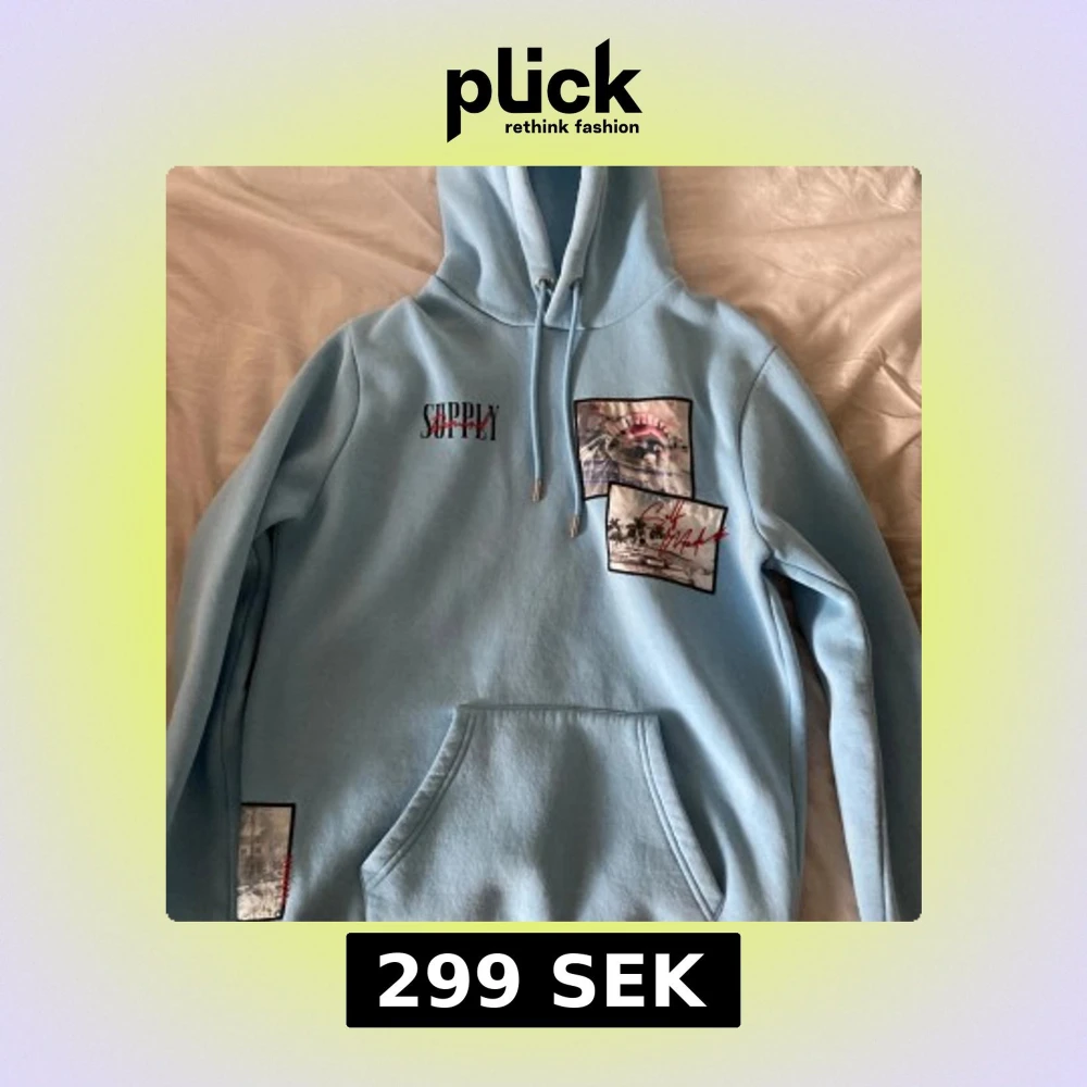 Säljer en ljusblå hoodie från Supply & Demand med tryck av palmer och textdetaljer. Hoodien har en stor ficka framtill och justerbar huva. Perfekt för en avslappnad stil.
