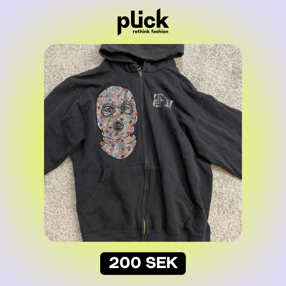 Cool svart hoodie med en stor strassdesign av en maskerad figur på framsidan och texten 'BANK ROBBER' i strass på baksidan. Köpt för 1100kr