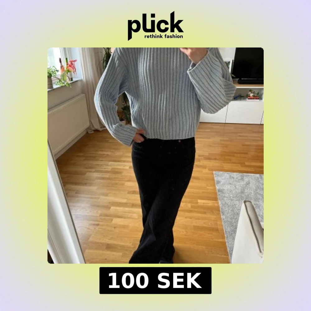 Säljer en ljusblå ribbad tröja från H&M Divided i storlek M. Tröjan har en högre hals som jag vikt ner på bilderna, långärmade och loose passform. Materialet är väldigt mjukt och bekvämt och stickat, perfekt för att hålla dig varm under kyliga dagar. Snygg att styla med både jeans och kjol. Den är lite cropped i modellen och knappt använd