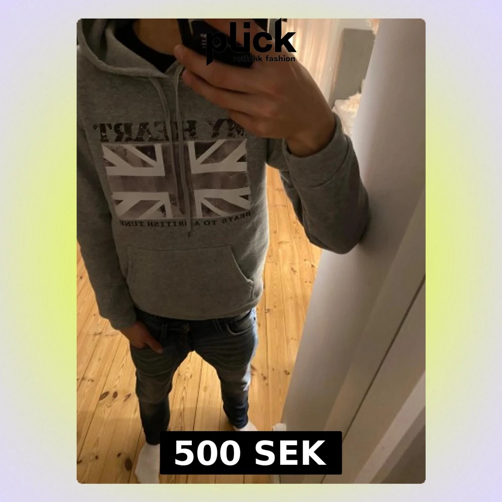 Grå hoodie med tryck av Union Jack och texten 'MY HEART BEATS TO A BRITISH TUNE' på bröstet. Tröjan har huva med snörning och en stor magficka. Perfekt för dig som gillar streetstyle och vill ha en chill look.