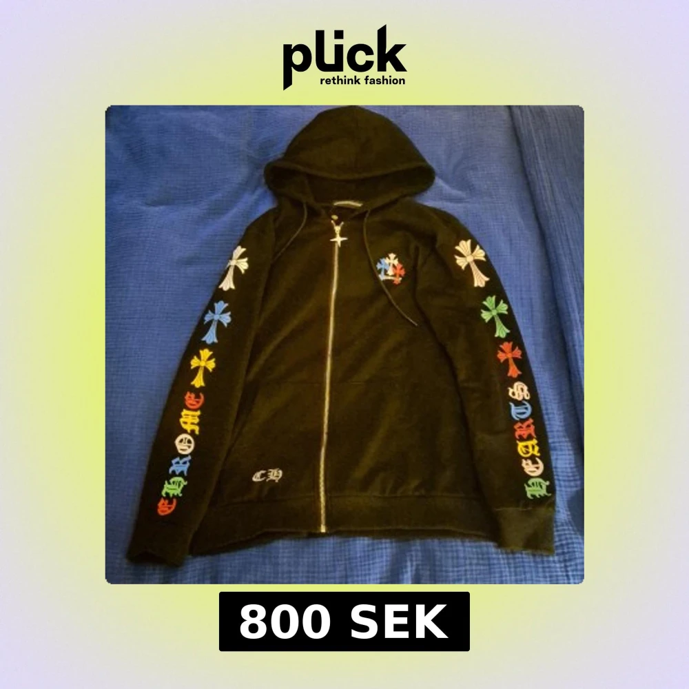 Svart hoodie från Chrome Hearts med huva och dragkedja. Ärmarna och ryggen har broderade kors i blått, rött, grönt, gult och vitt samt texten 'Chrome Hearts' i färgglada bokstäver. CH-logga broderad framtill. Grym streetwear-vibe och detaljerad design.