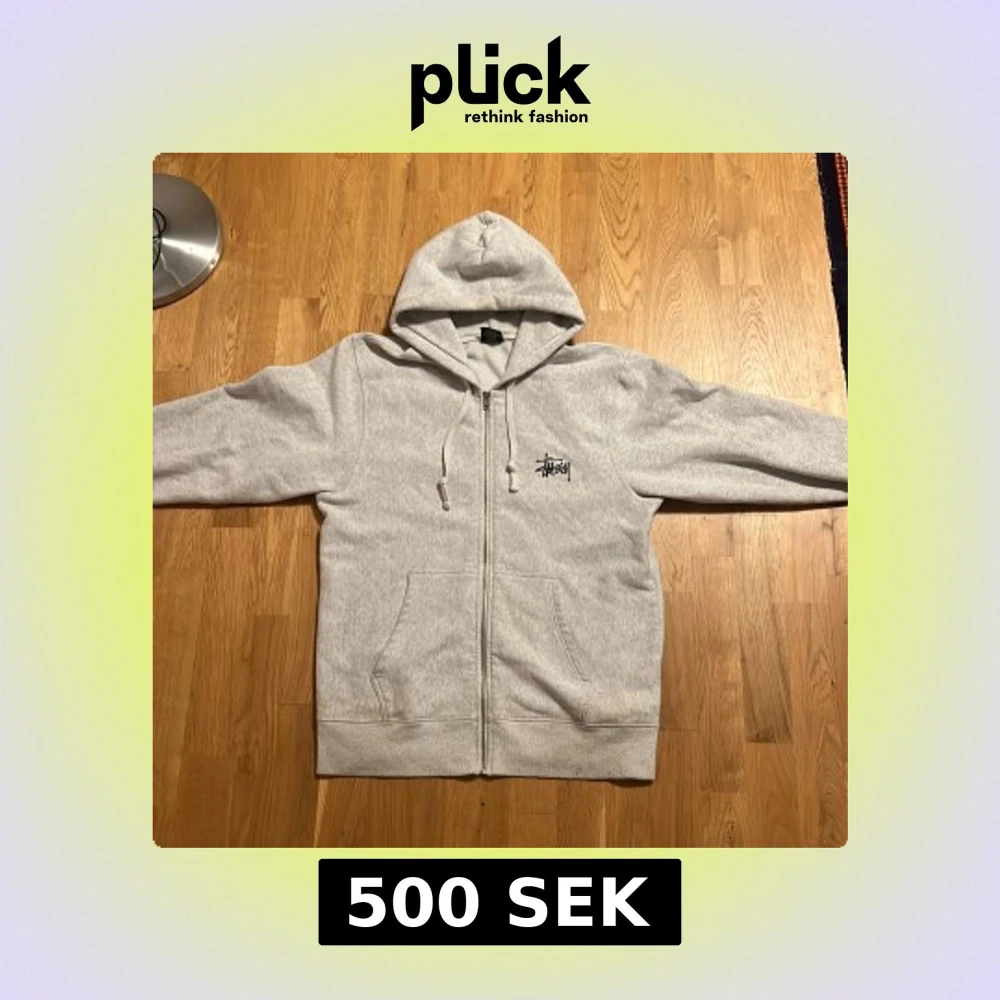 Säljer en ljusgrå hoodie från Stüssy i storlek M. Tröjan har dragkedja, huva med snörning och stora fickor framtill. Stüssy-logga tryckt på bröstet och en stor logga på ryggen. Perfekt streetwear-vibe och riktigt skön att bära.