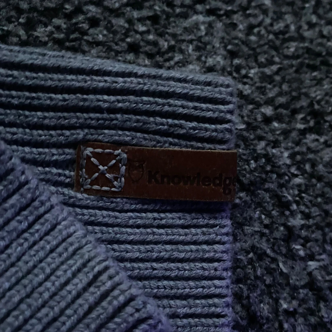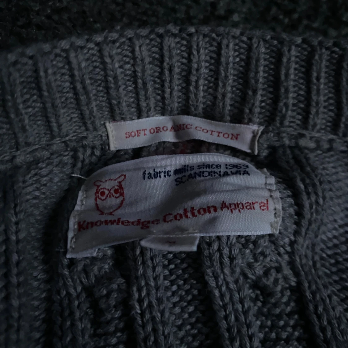 Säljer en grå kabelstickad tröja från Knowledge Cotton Apparel i mjuk ekologisk bomull. Tröjan har rund hals, ribbade muddar och lång ärm. Perfekt för lager-på-lager och chill höst- eller vinterstil.
