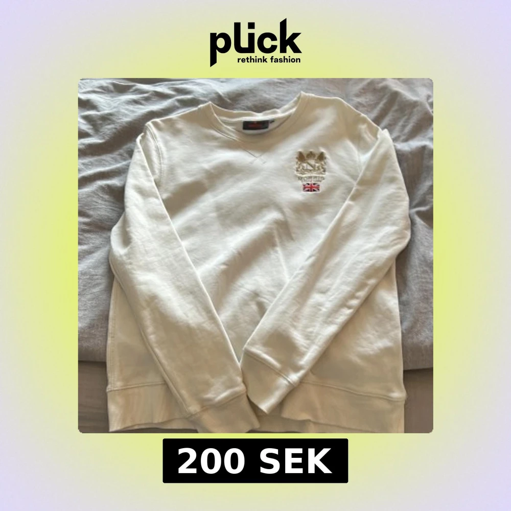 Säljer en stilren vit sweatshirt med en broderad logga och brittisk flagga på bröstet. Tröjan har långa ärmar och ribbade muddar vid ärmslut och nederkant. Perfekt för en avslappnad stil.