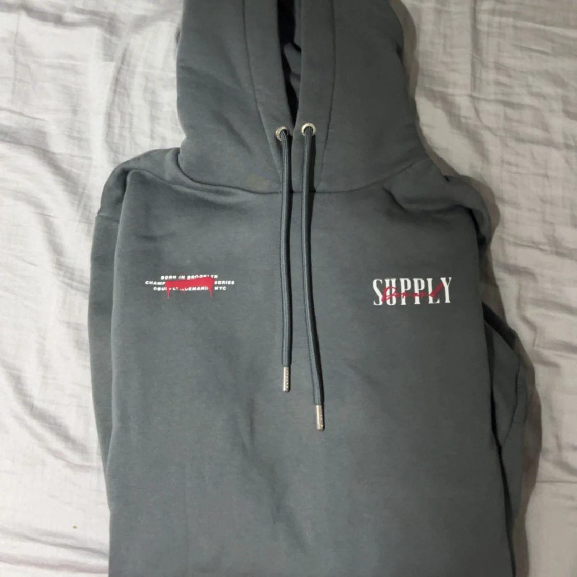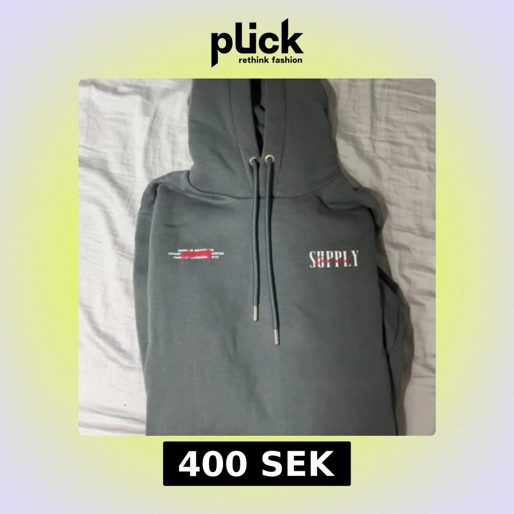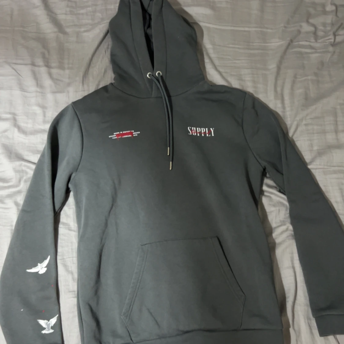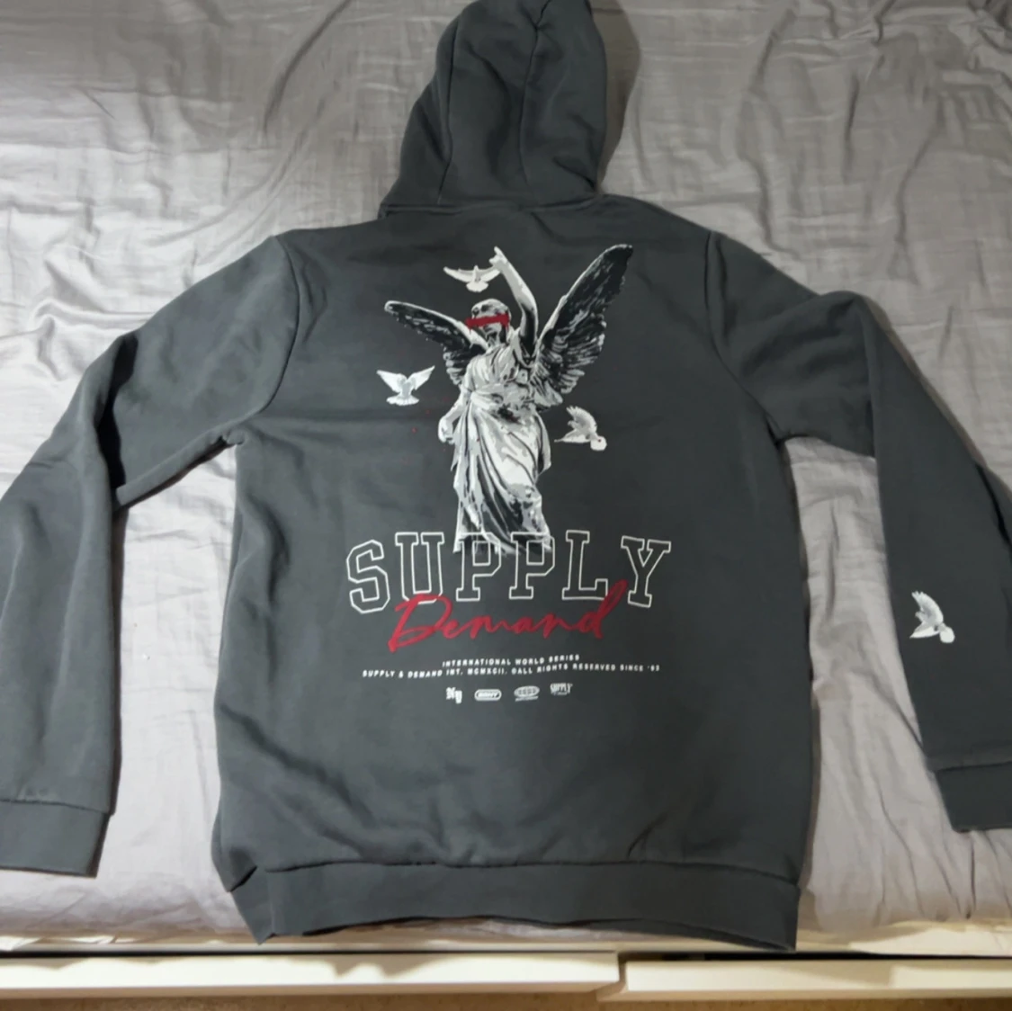 Snygg grå hoodie från Supply & Demand med tryck på bröstet och stor grafisk print på ryggen med ängel och text. Ficka framtill, huva med snörning och vita fågeltryck på ärmarna. Perfekt för dig som gillar streetwear och unika detaljer.